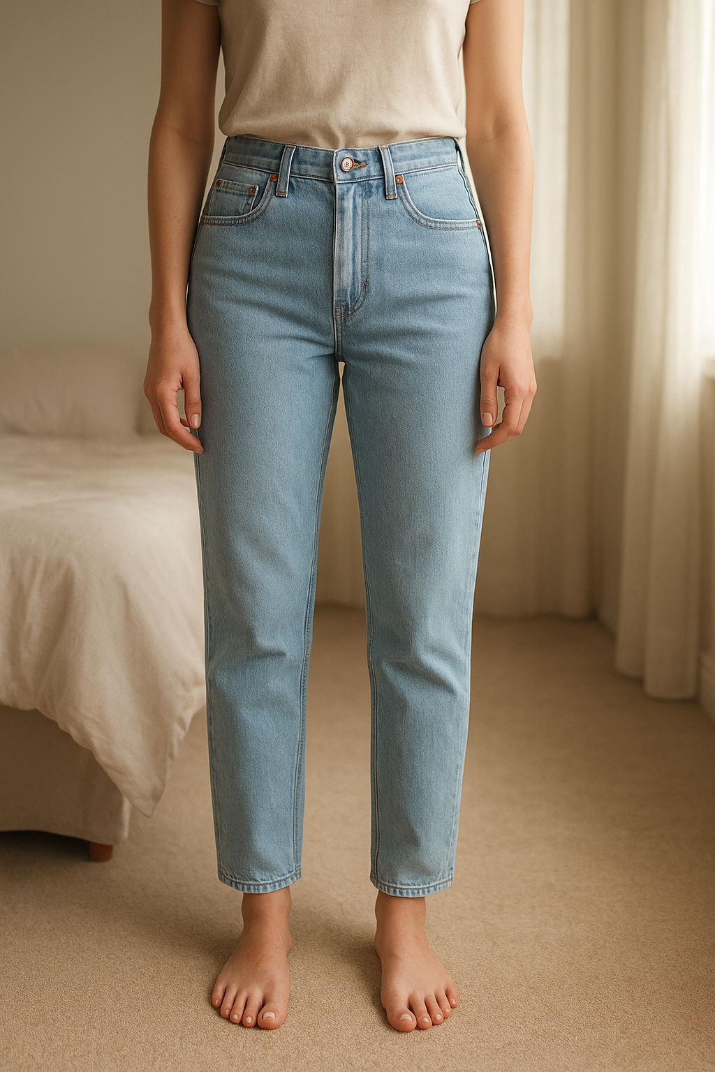 Jean Levi’s Bleu debout, face à la caméra, dans une chambre à la lumière douce, avec une lumière naturelle filtrant par la fenêtre.