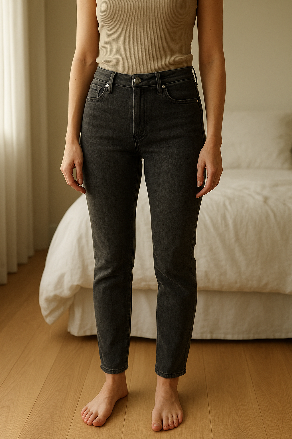 Jean mango debout, face à la caméra, dans une chambre à la lumière douce, avec une lumière naturelle filtrant par la fenêtre.