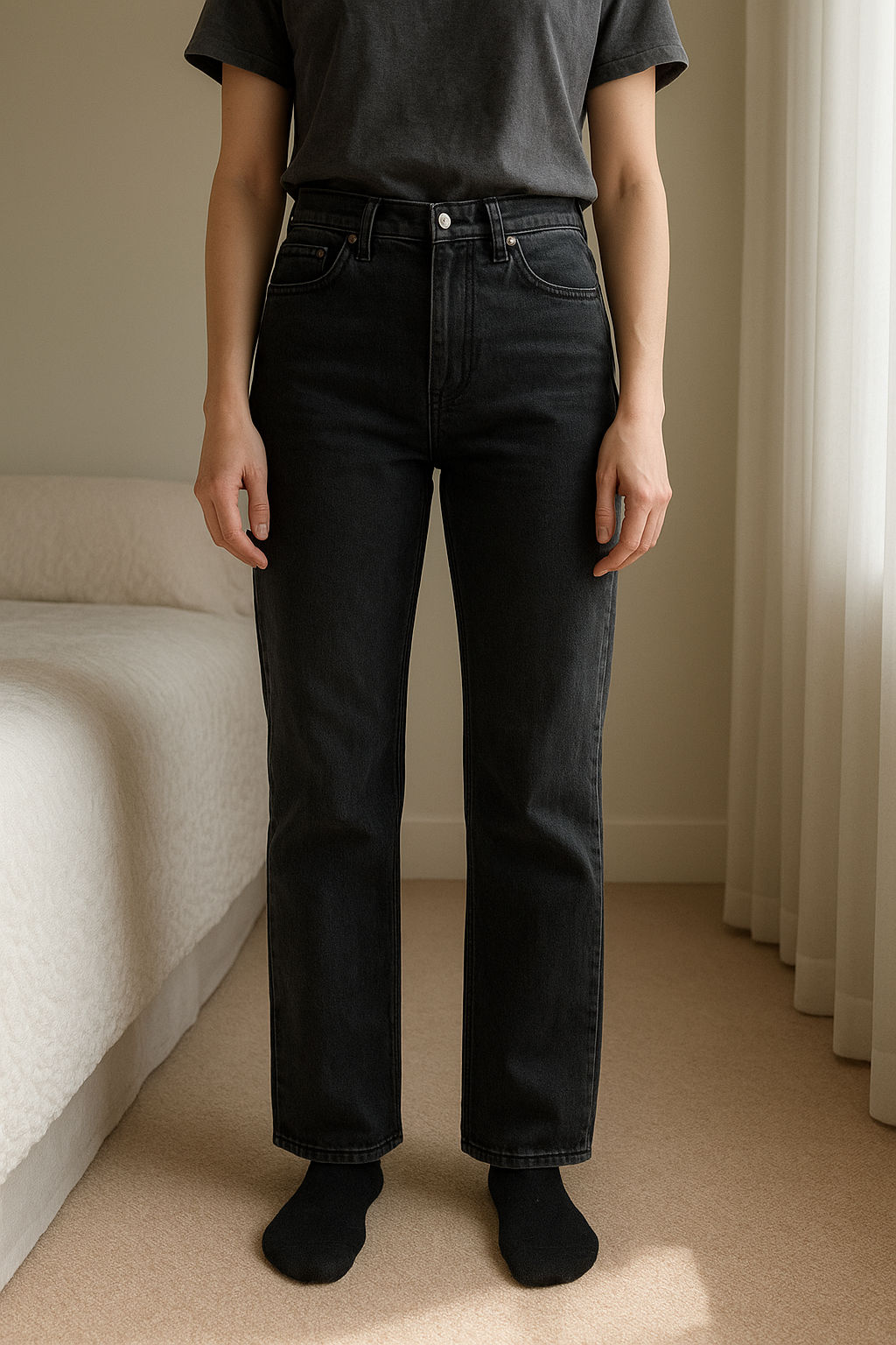Jean noir debout, face à la caméra, dans une chambre à la lumière douce, avec une lumière naturelle filtrant par la fenêtre.