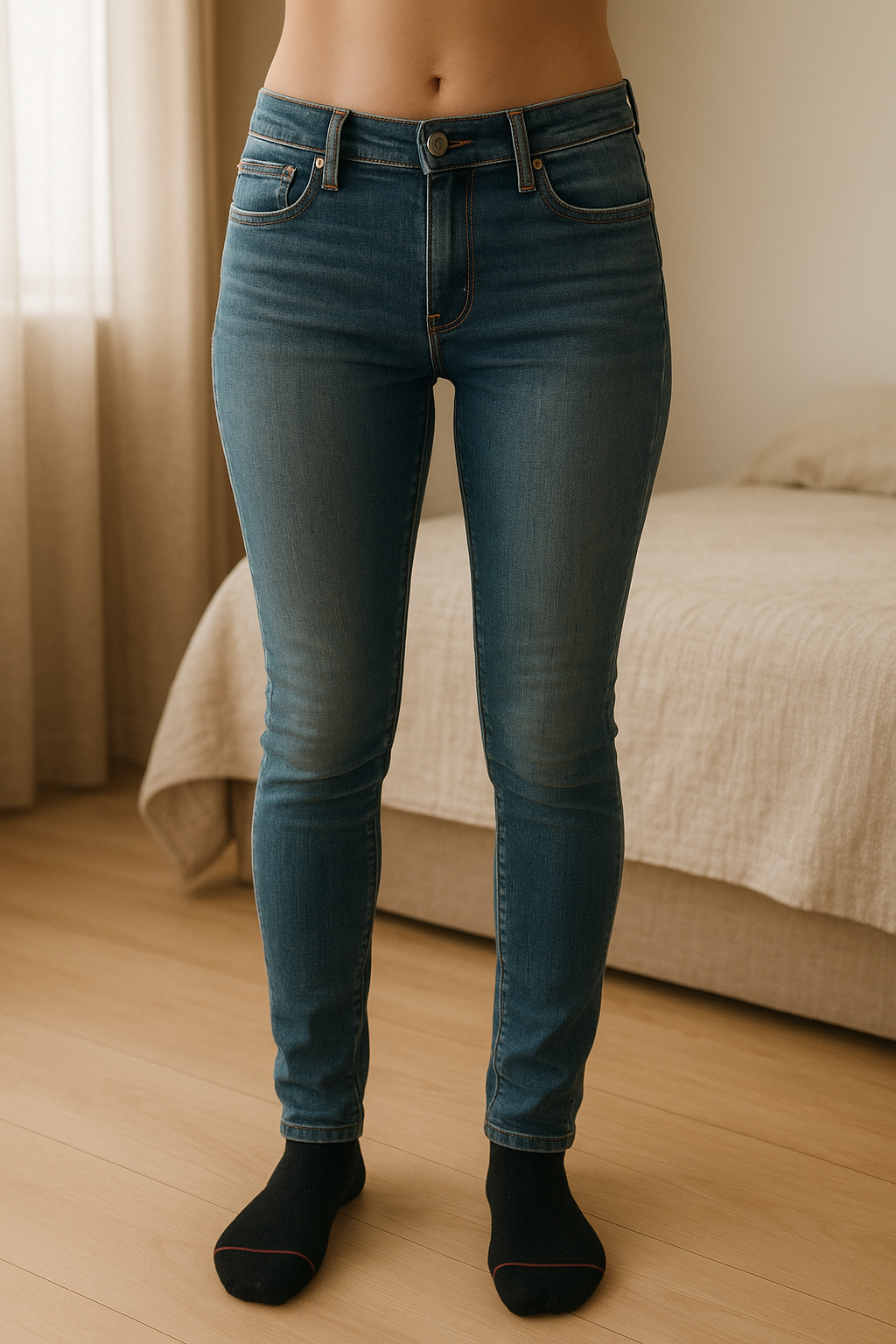 Jean skinny Abercombie fitch 34 bleu denim debout, face à la caméra, dans une chambre à la lumière douce, avec une lumière naturelle filtrant par la fenêtre.