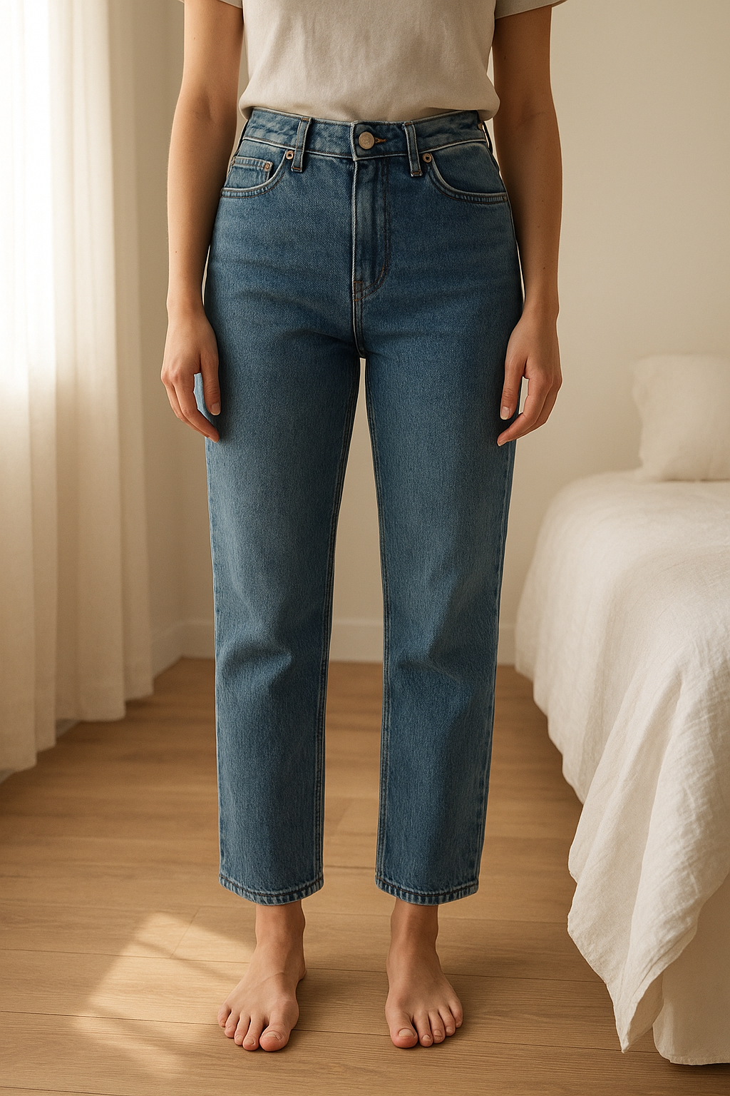 Jean taille S femme Demin Pimkie debout, face à la caméra, dans une chambre à la lumière douce, avec une lumière naturelle filtrant par la fenêtre.