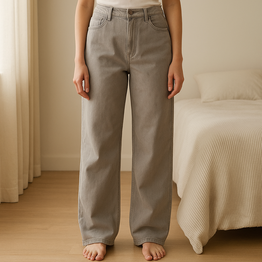 Jean évasé gris debout, face à la caméra, dans une chambre à la lumière douce, avec une lumière naturelle filtrant par la fenêtre.