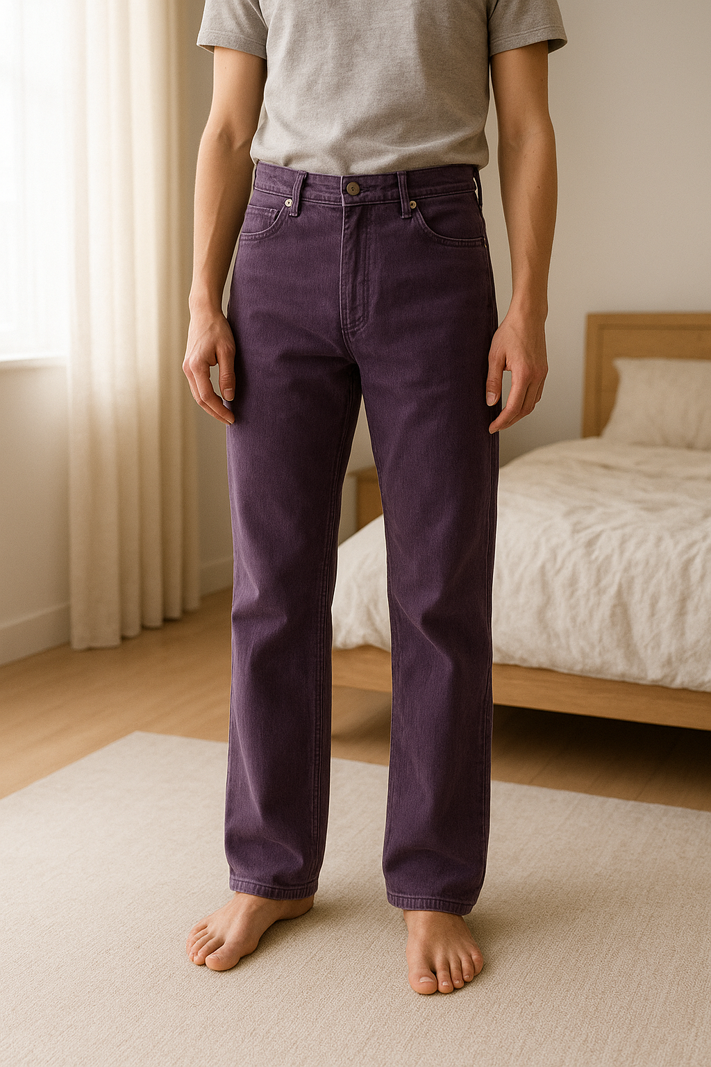 Jean Vintage élastice t 3 dorotennis debout, face à la caméra, dans une chambre à la lumière douce, avec une lumière naturelle filtrant par la fenêtre.