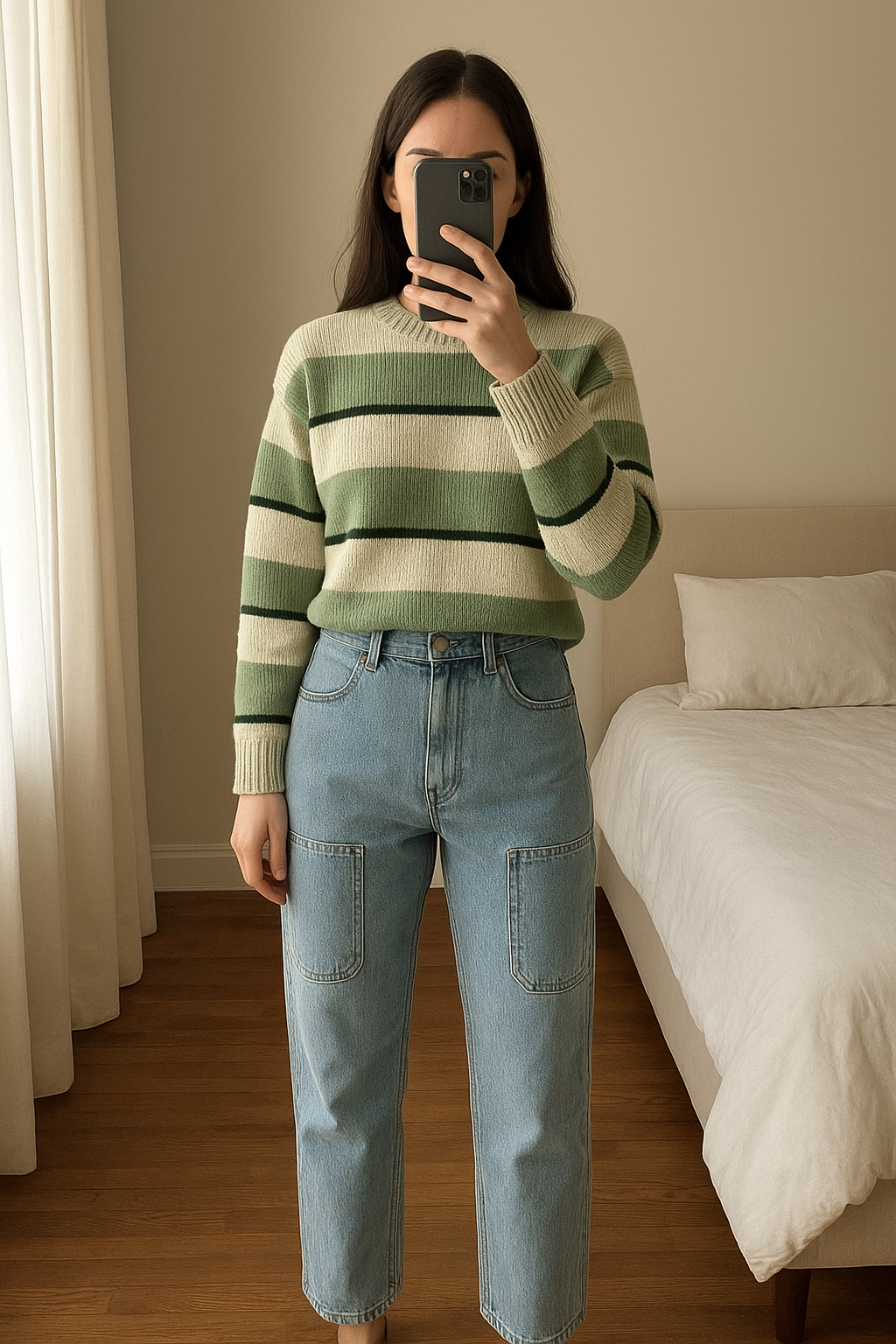 Jeans cargo large et pull court debout, face à la caméra, dans une chambre à la lumière douce, avec une lumière naturelle filtrant par la fenêtre.