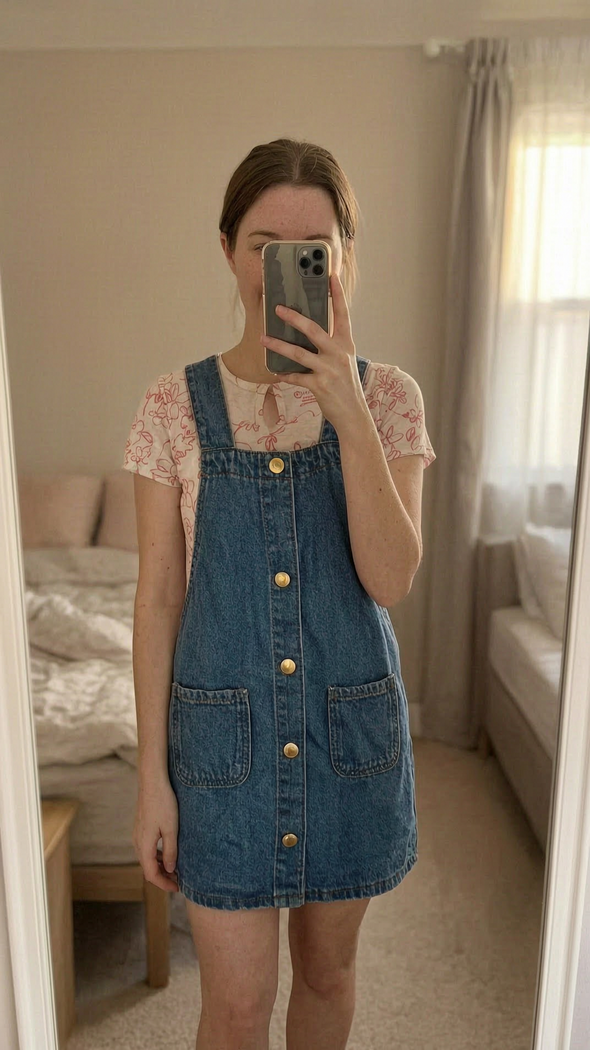 Jeans Latzkleid mit T-shirt aufrecht stehend, der Kamera zugewandt, in einem sanft beleuchteten Schlafzimmer, mit natürlichem Licht, das durch ein Fenster fällt.