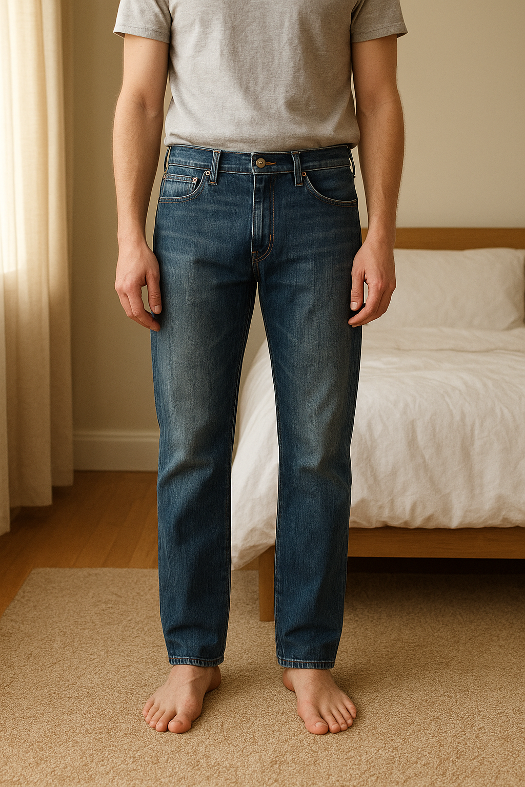 Jeans Levi’s debout, face à la caméra, dans une chambre à la lumière douce, avec une lumière naturelle filtrant par la fenêtre.