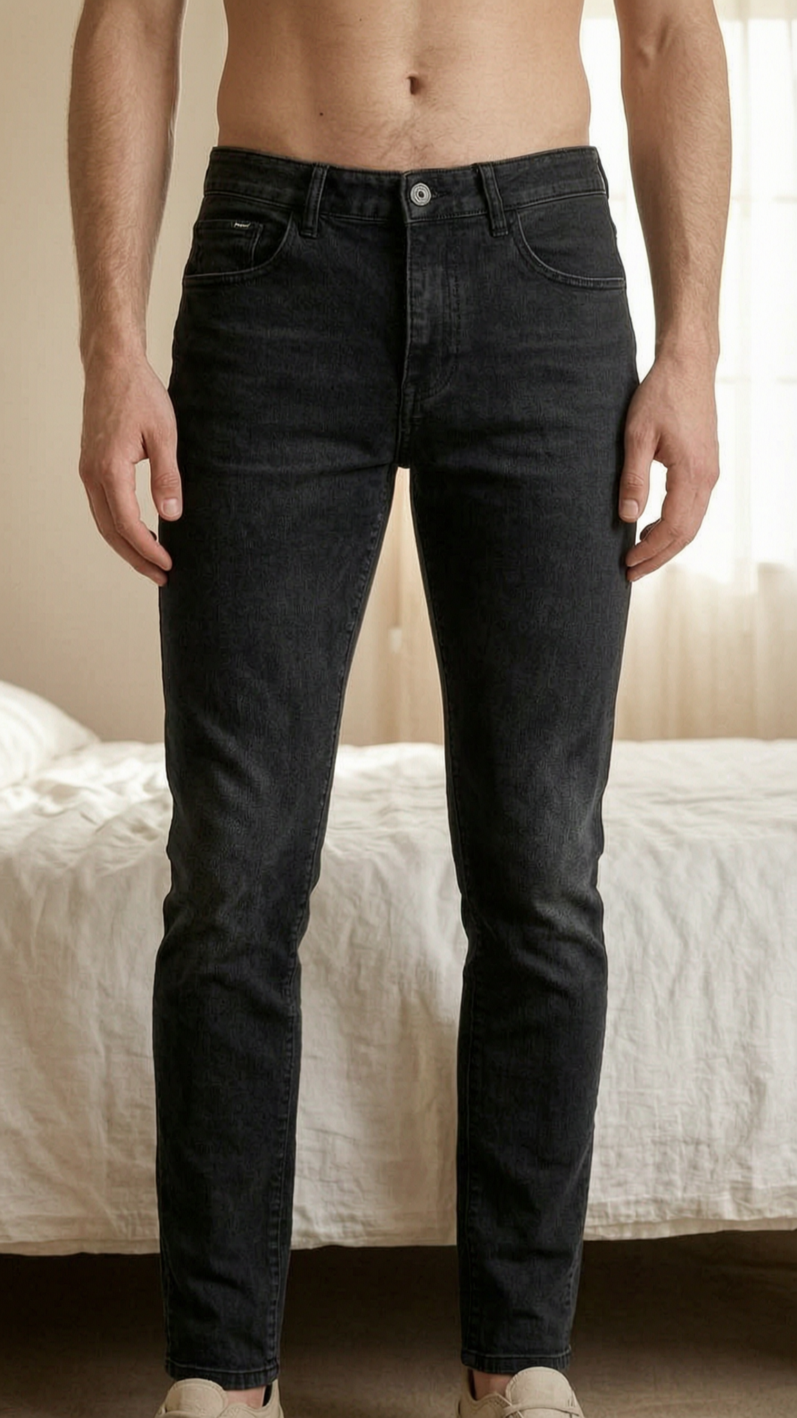 jeans neri elasticizzati pepe jeans in piedi, rivolto verso la fotocamera, in una camera da letto con luce soffusa e luce naturale che filtra dalla finestra.