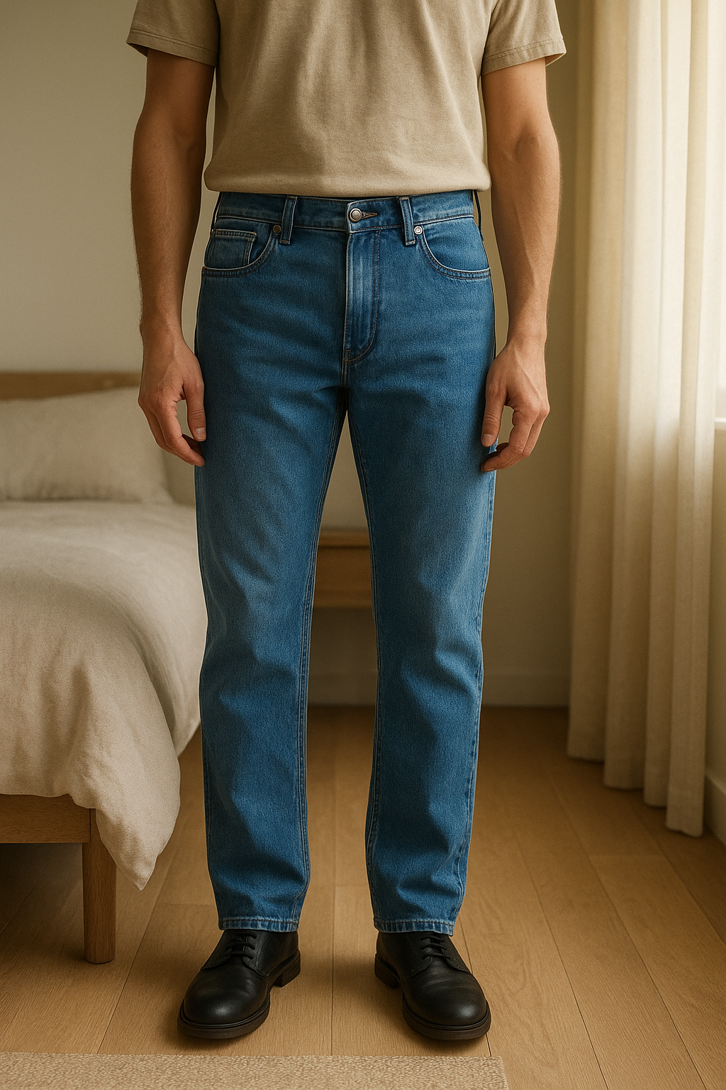 Jeans Uomo Rica Lewis Dritti Taglia 42 IT / 32W in piedi, rivolto verso la fotocamera, in una camera da letto con luce soffusa e luce naturale che filtra dalla finestra.