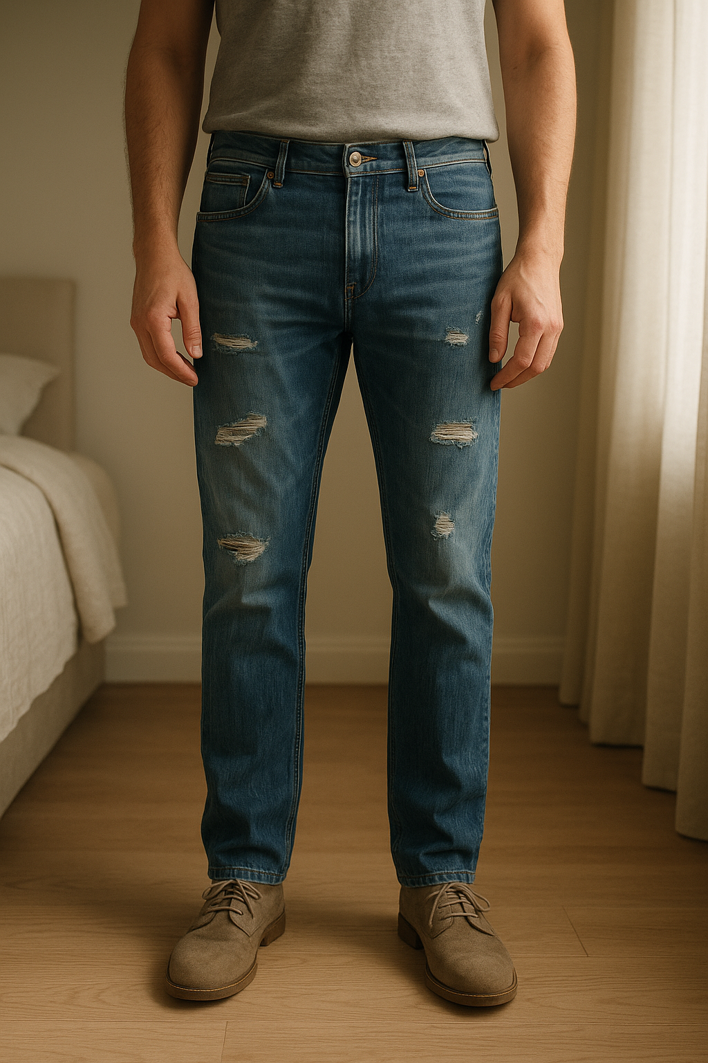 Jeans w34 debout, face à la caméra, dans une chambre à la lumière douce, avec une lumière naturelle filtrant par la fenêtre.