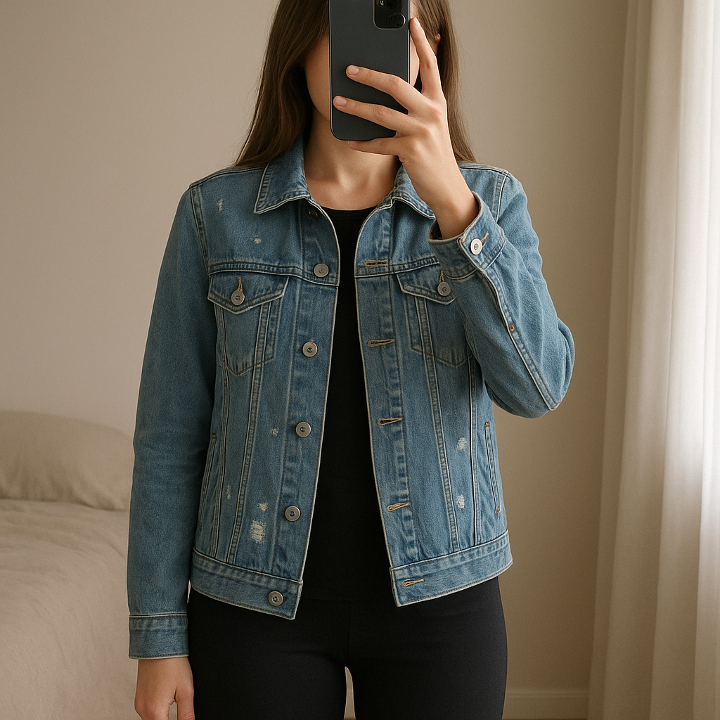 Jeansjacke mit Used-Look / Vintage Style aufrecht stehend, der Kamera zugewandt, in einem sanft beleuchteten Schlafzimmer, mit natürlichem Licht, das durch ein Fenster fällt.