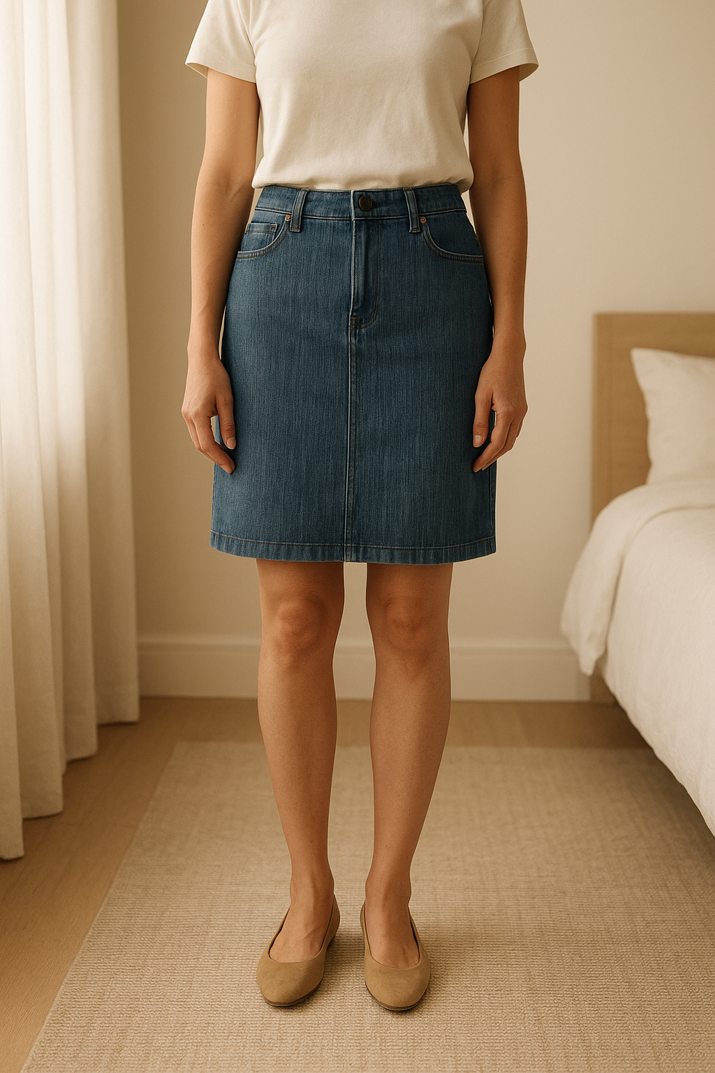 Jeansrok - Bensimon - maat 42 - zeer goed! debout, face à la caméra, dans une chambre à la lumière douce, avec une lumière naturelle filtrant par la fenêtre.