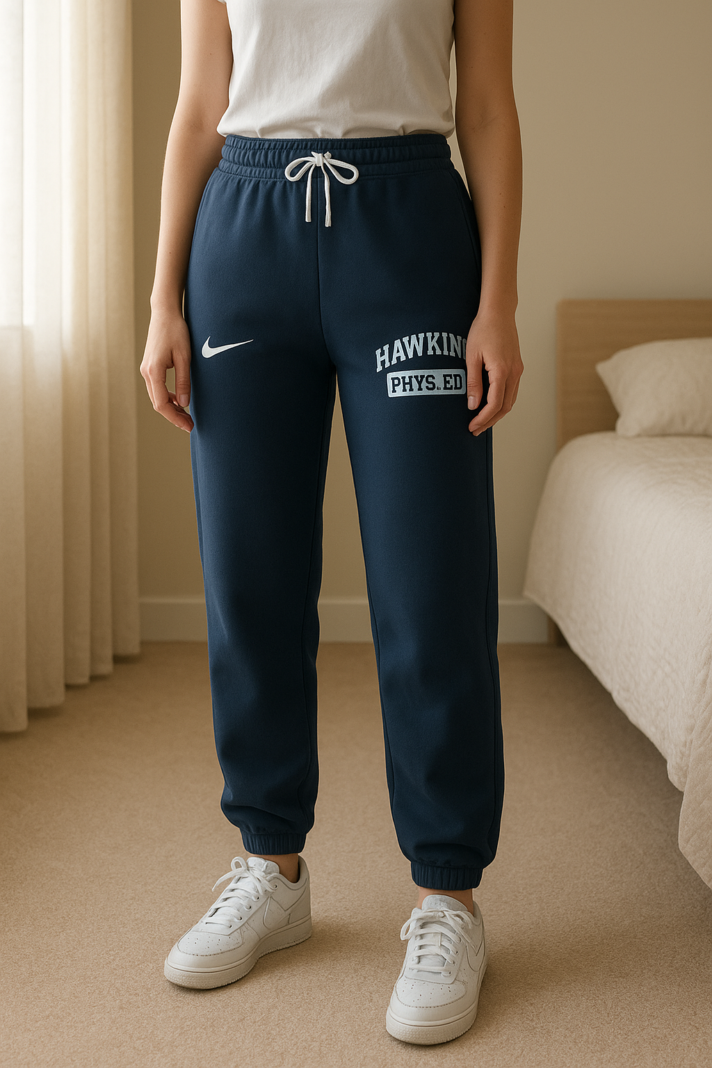 Jogging NIKE x Stranger Things Neuf Taille L debout, face à la caméra, dans une chambre à la lumière douce, avec une lumière naturelle filtrant par la fenêtre.