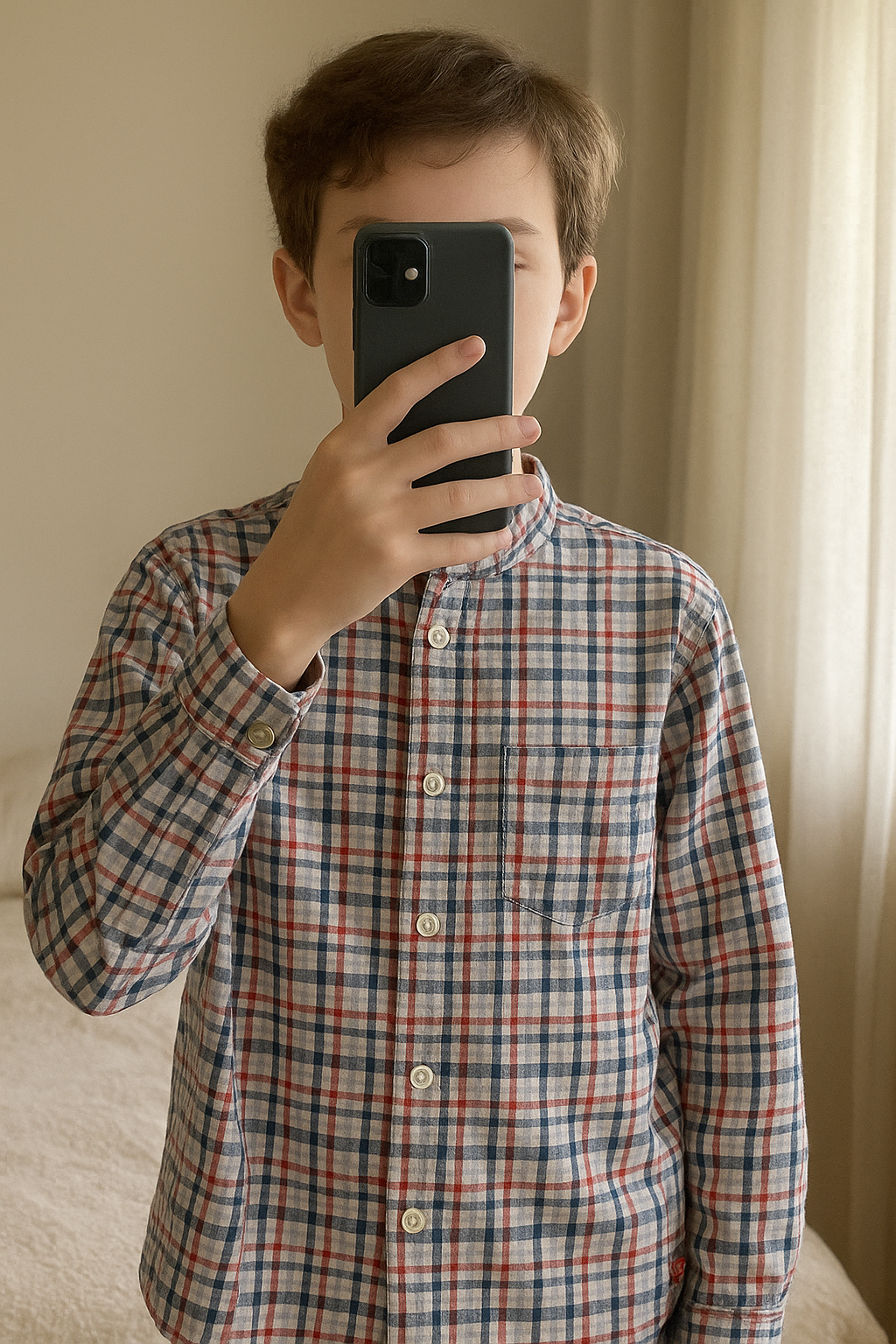 Jolie chemise à carreaux Obaïbi taille 6 mois 🌸 debout, face à la caméra, dans une chambre à la lumière douce, avec une lumière naturelle filtrant par la fenêtre.