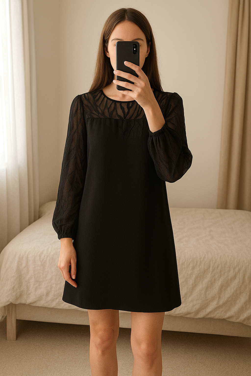Jolie robe noire taille L debout, face à la caméra, dans une chambre à la lumière douce, avec une lumière naturelle filtrant par la fenêtre.