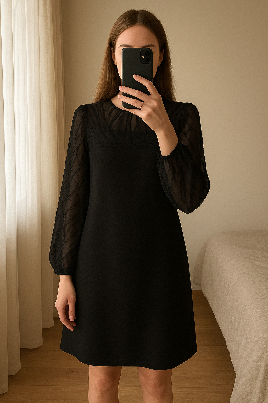 Jolie robe noire taille L debout, face à la caméra, dans une chambre à la lumière douce, avec une lumière naturelle filtrant par la fenêtre.