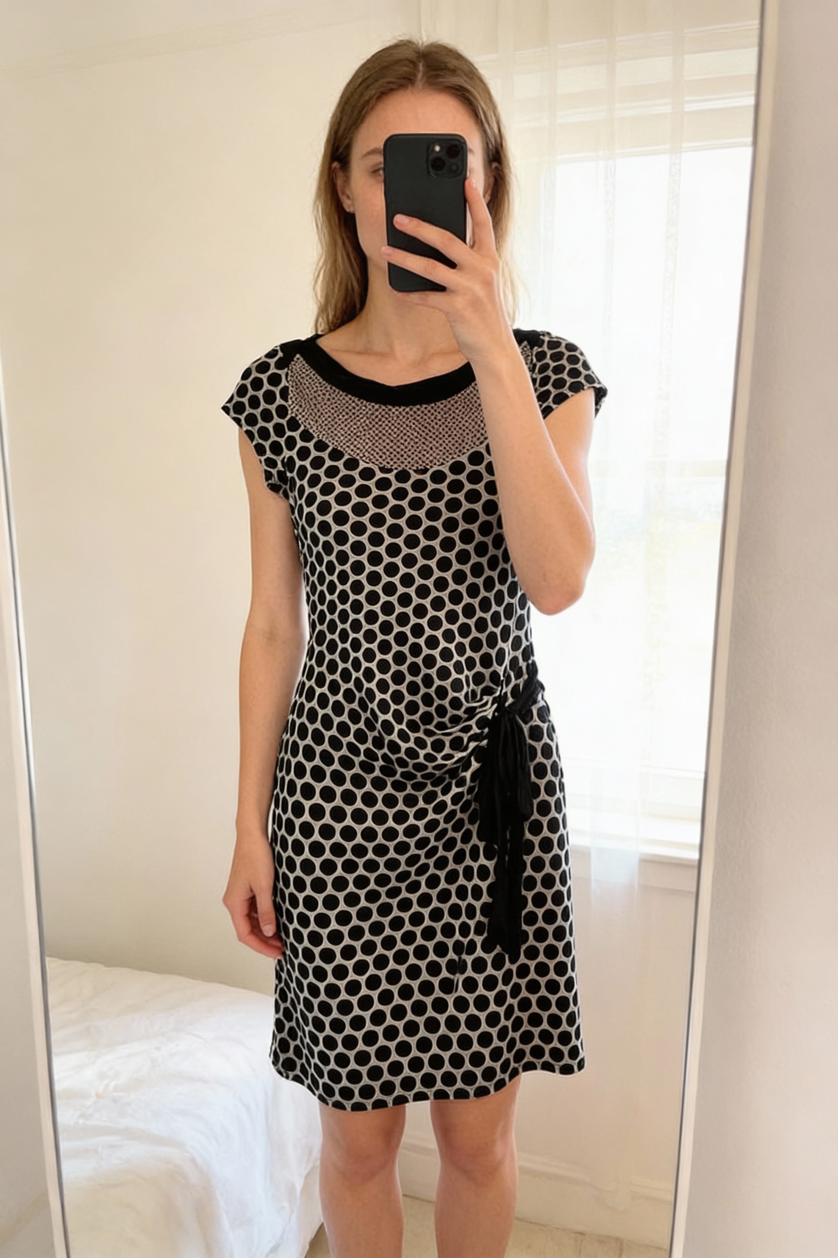Jolie robe à pois debout, face à la caméra, dans une chambre à la lumière douce, avec une lumière naturelle filtrant par la fenêtre.