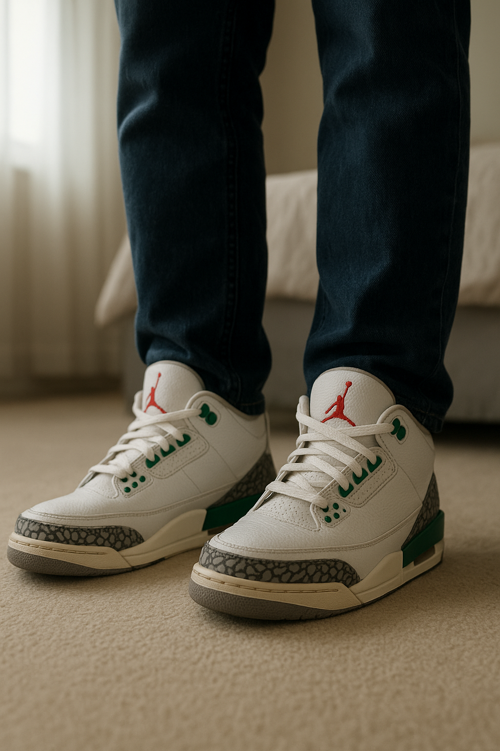 Jordan 3 debout, face à la caméra, dans une chambre à la lumière douce, avec une lumière naturelle filtrant par la fenêtre.