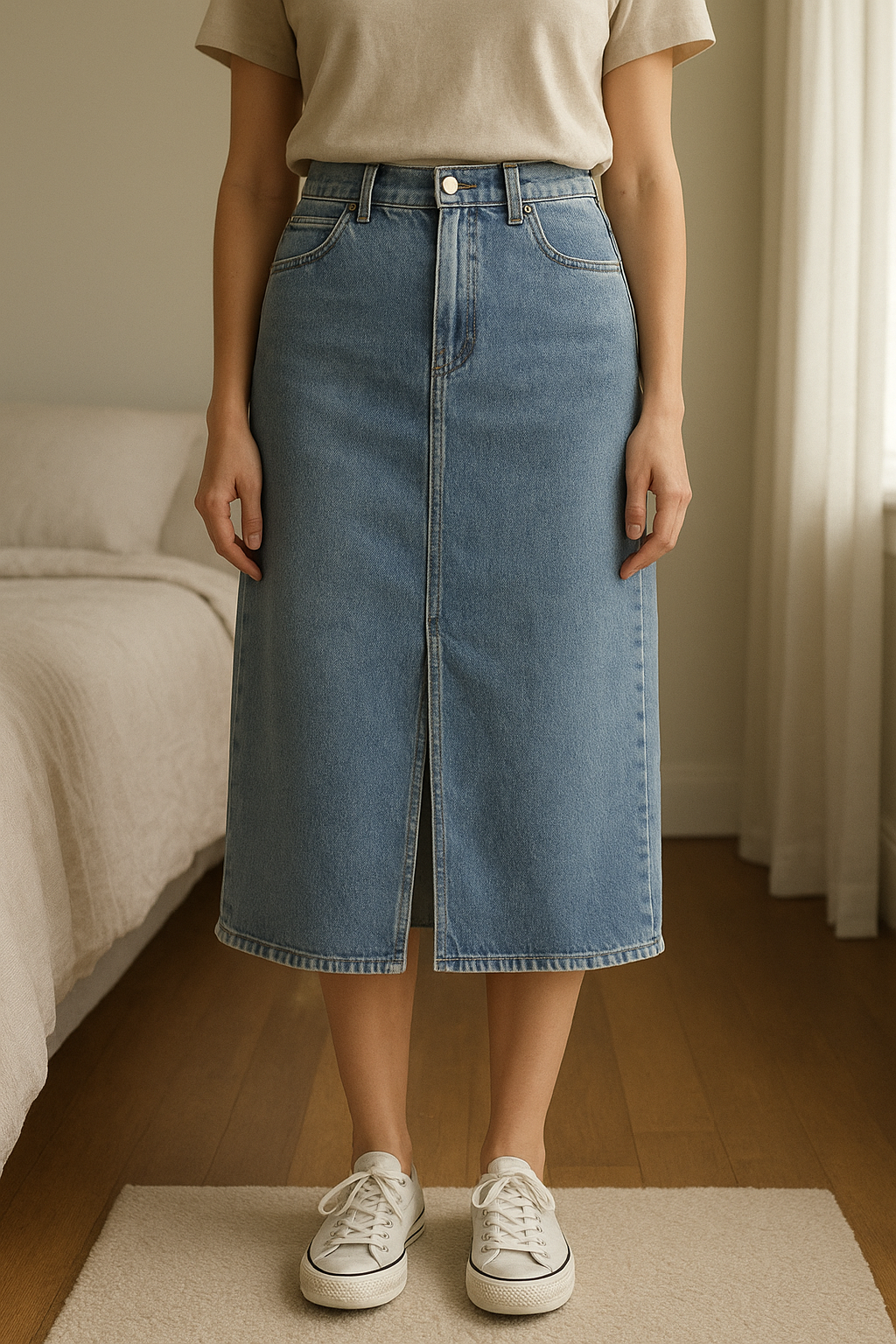 Jupe en jean debout, face à la caméra, dans une chambre à la lumière douce, avec une lumière naturelle filtrant par la fenêtre.