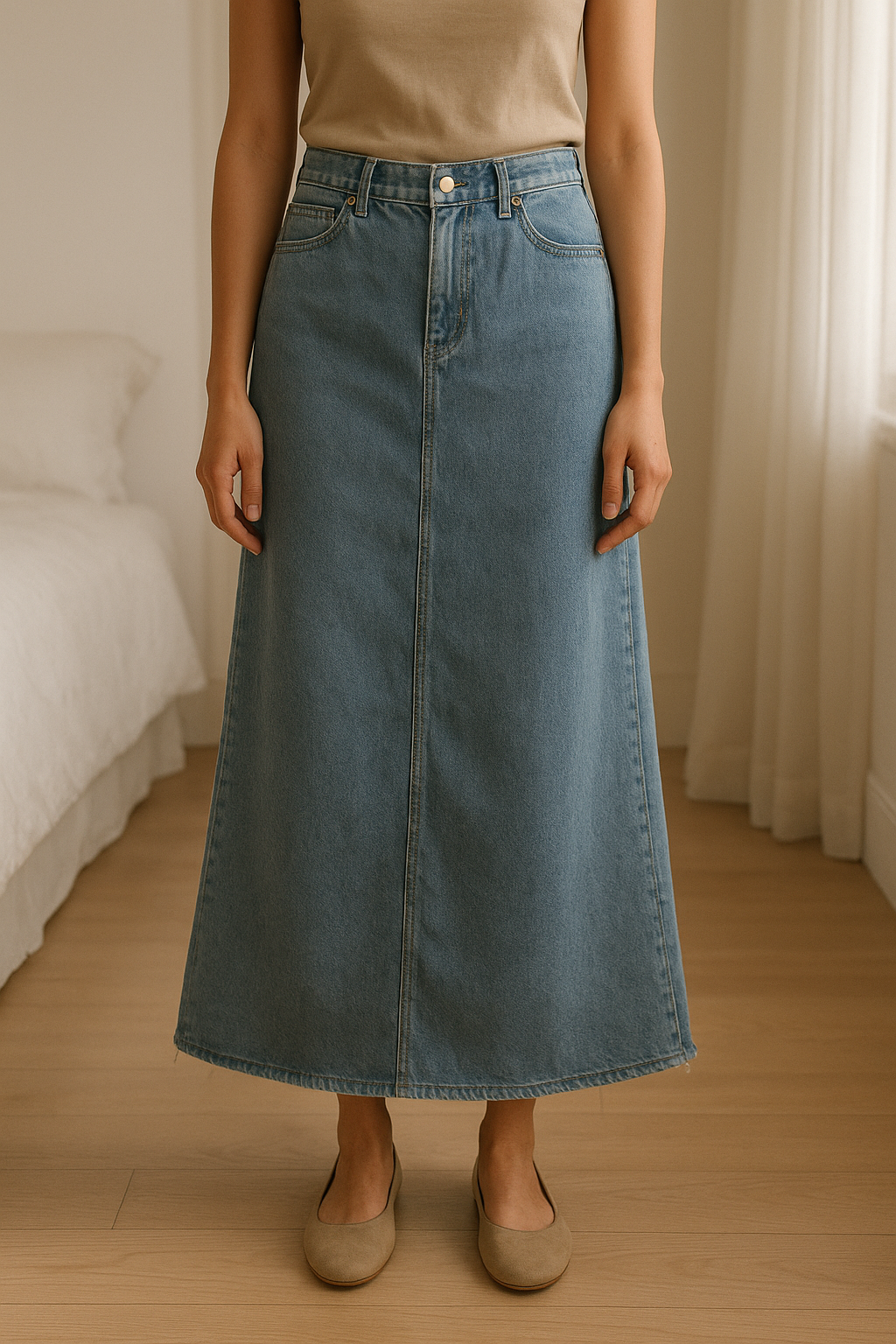 Jupe jean debout, face à la caméra, dans une chambre à la lumière douce, avec une lumière naturelle filtrant par la fenêtre.