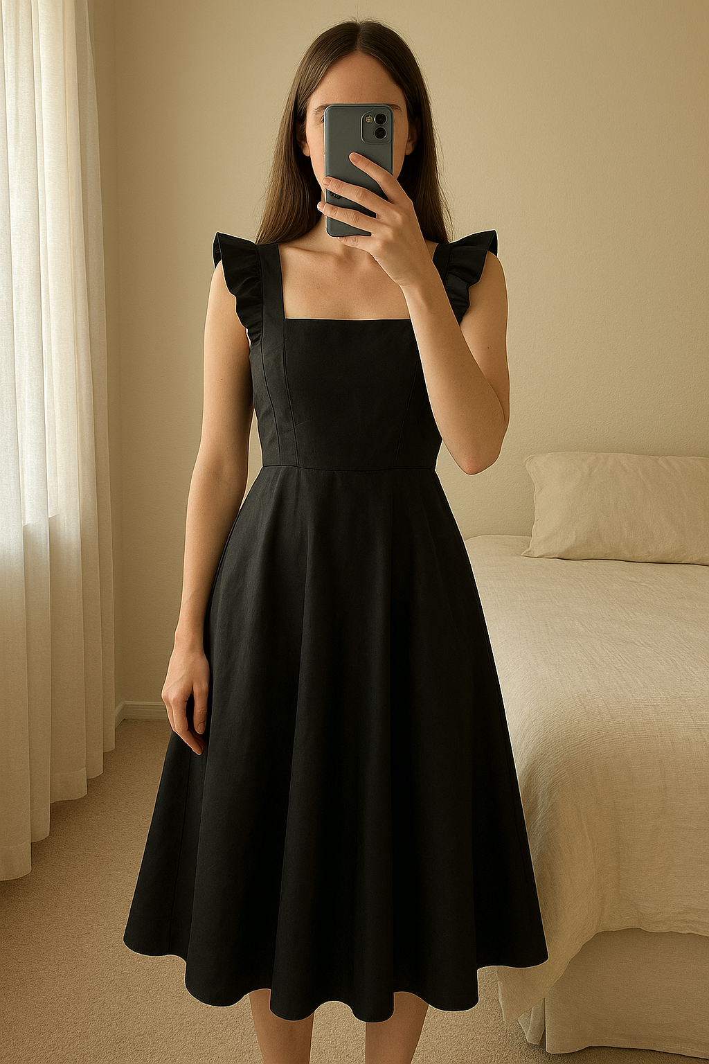 Jupe noire en simili debout, face à la caméra, dans une chambre à la lumière douce, avec une lumière naturelle filtrant par la fenêtre.
