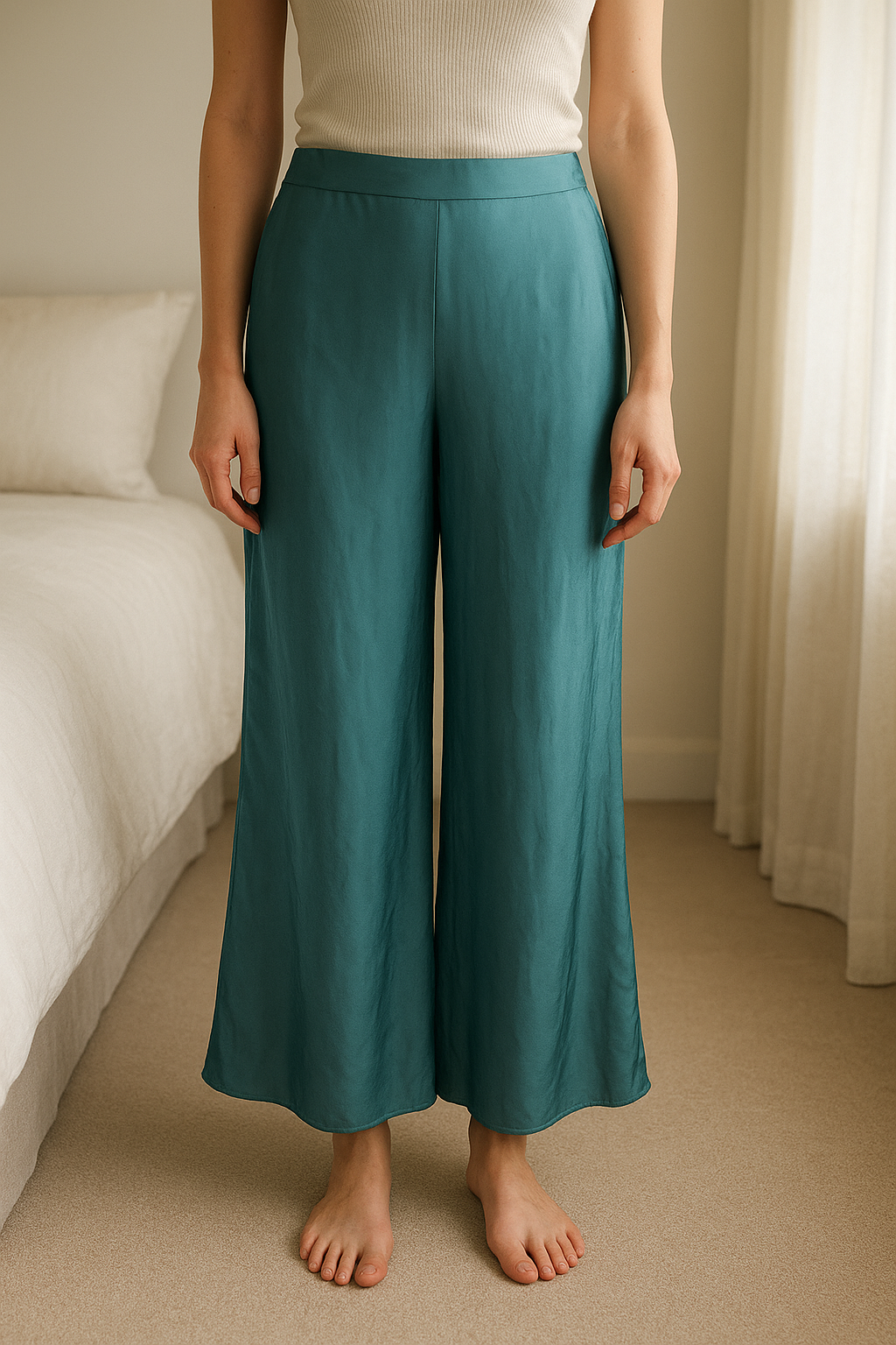 jupe touché doux style satin bleue clair 38 de pie, mirando a la cámara, en un dormitorio con luz suave y natural filtrándose por la ventana.