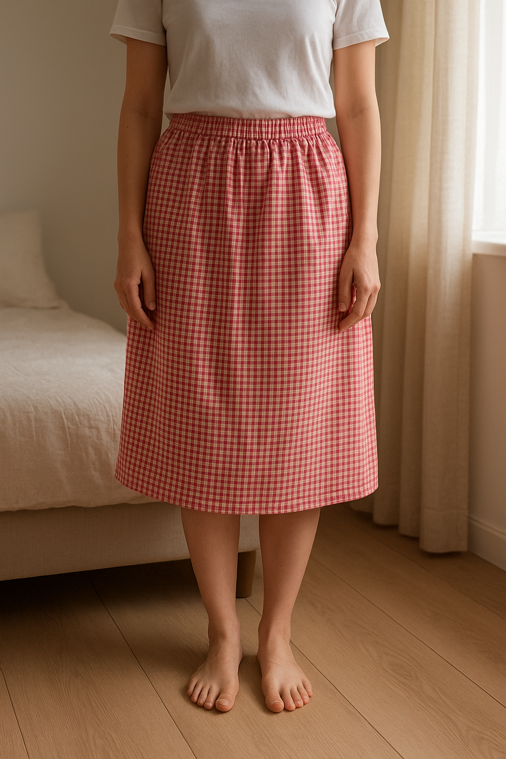 Jupe vichy debout, face à la caméra, dans une chambre à la lumière douce, avec une lumière naturelle filtrant par la fenêtre.