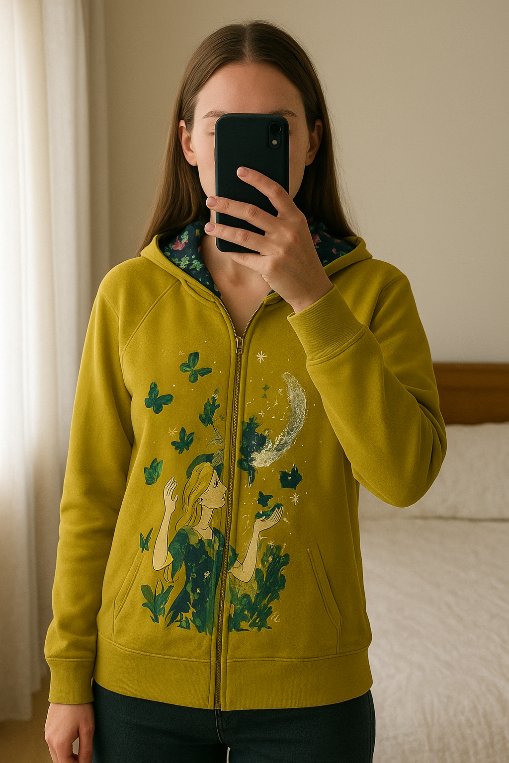 Just Addict zelená mikina dámská standing straight facing the camera, in a softly lit bedroom setting, with gentle natural light filtering through a window.