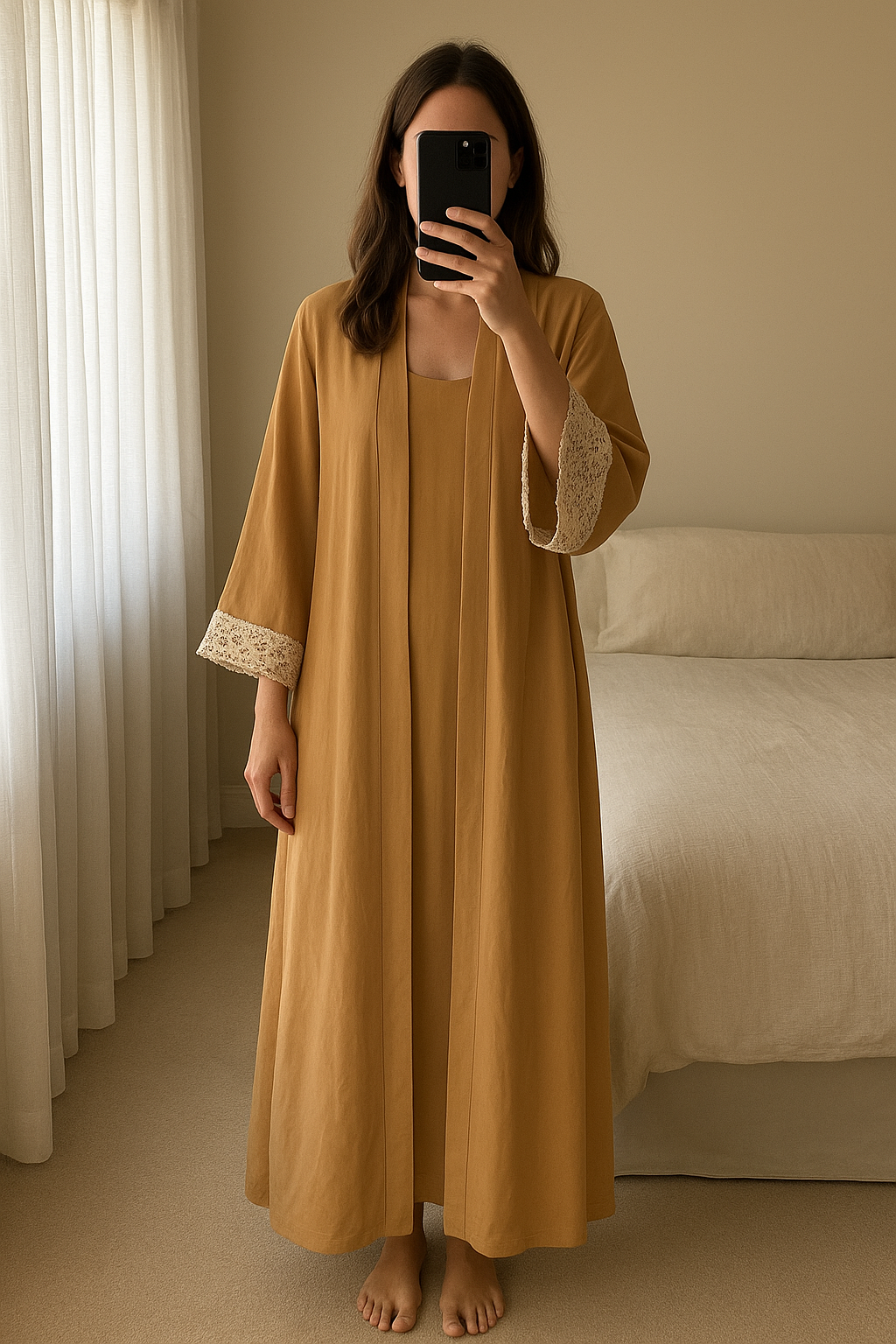 Kimono camel avec broderie dorée debout, face à la caméra, dans une chambre à la lumière douce, avec une lumière naturelle filtrant par la fenêtre.