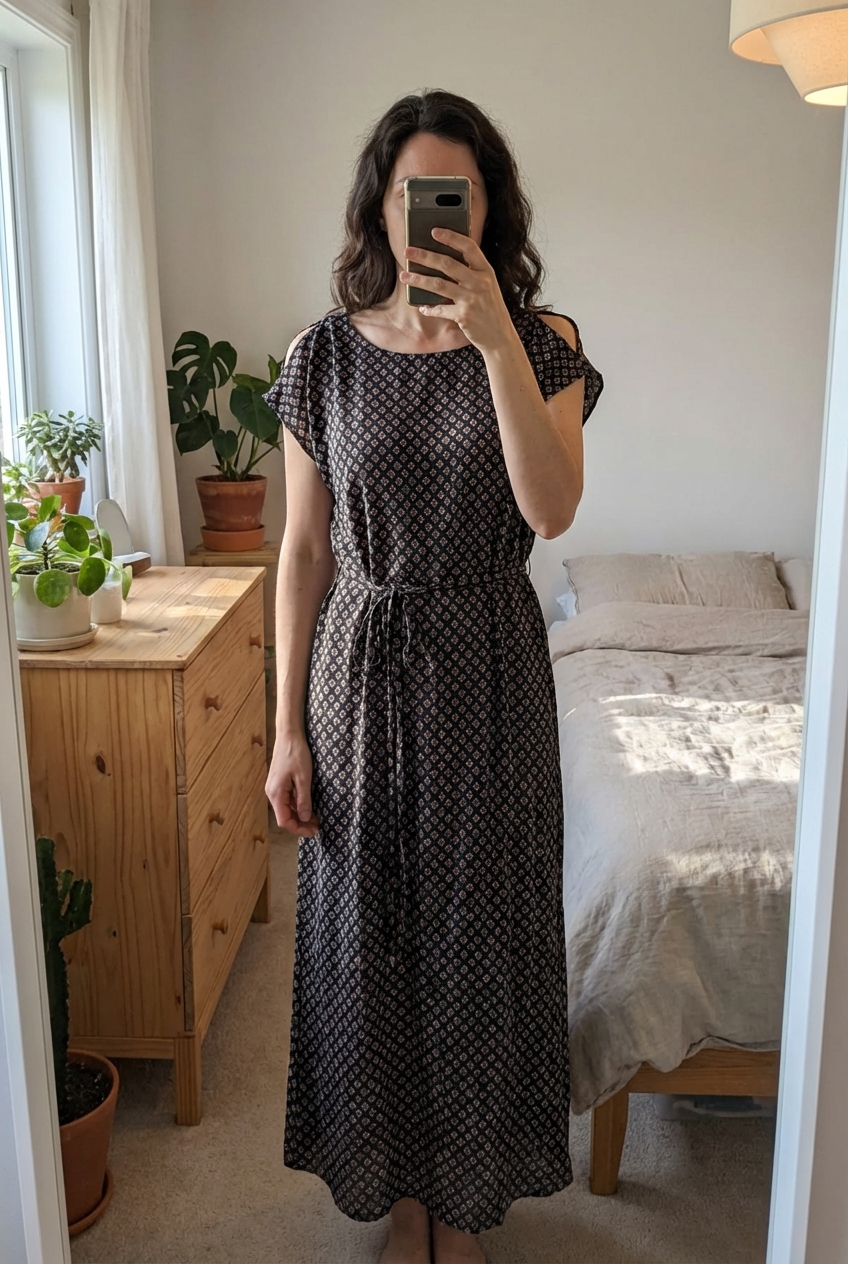 Kleid mit tollem Muster | Gr. 32-34 aufrecht stehend, der Kamera zugewandt, in einem sanft beleuchteten Schlafzimmer, mit natürlichem Licht, das durch ein Fenster fällt.