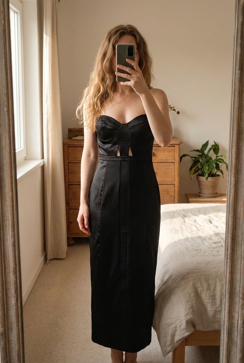 KOR@KOR schwarzes Minikleid aufrecht stehend, der Kamera zugewandt, in einem sanft beleuchteten Schlafzimmer, mit natürlichem Licht, das durch ein Fenster fällt.