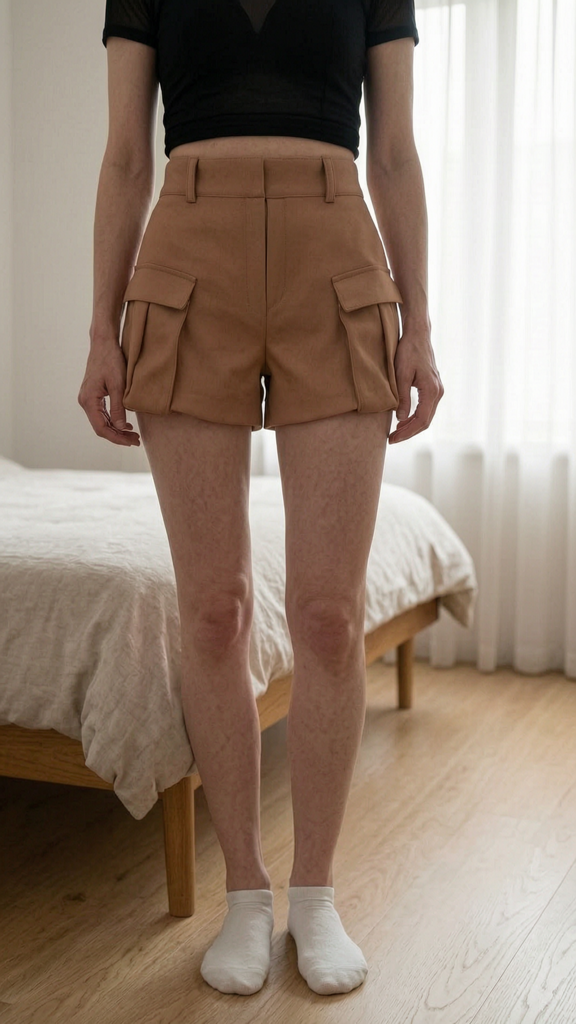 Kurze Hose House of cb aufrecht stehend, der Kamera zugewandt, in einem sanft beleuchteten Schlafzimmer, mit natürlichem Licht, das durch ein Fenster fällt.