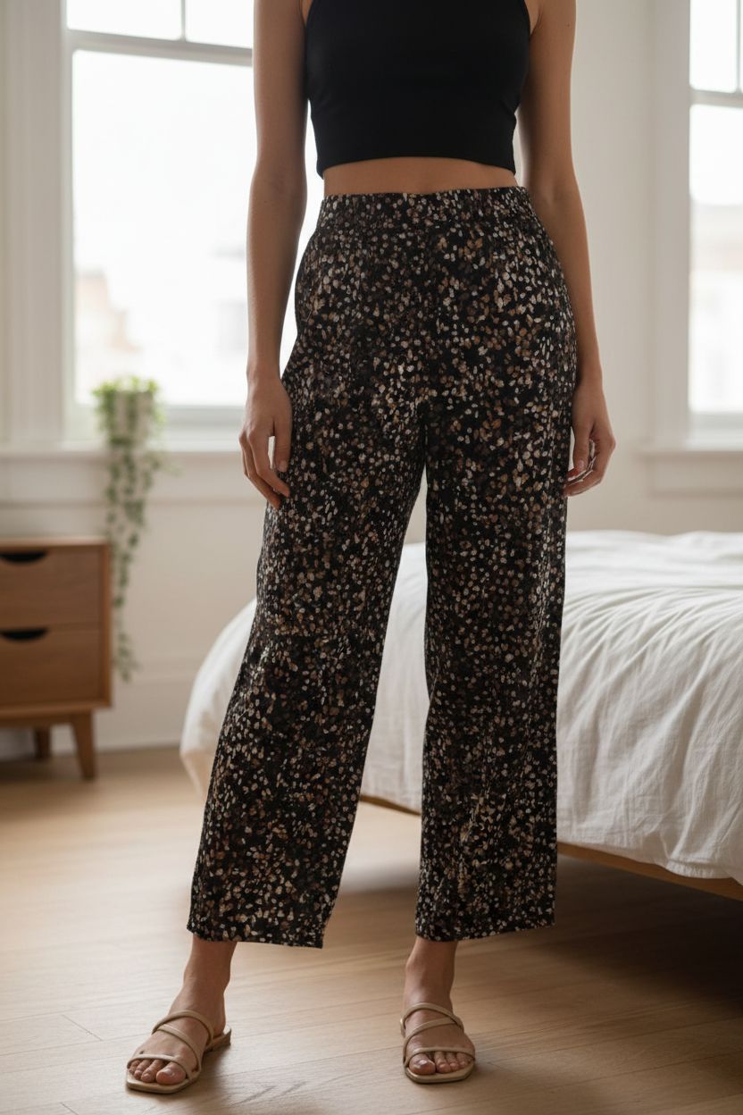 Eine Person in Kurzer Rock mit tollem Muster | Gr. 34 aufrecht stehend, der Kamera zugewandt, mit schlanker Figur, in einem sanft beleuchteten Schlafzimmer, mit natürlichem Licht, das durch ein Fenster fällt.