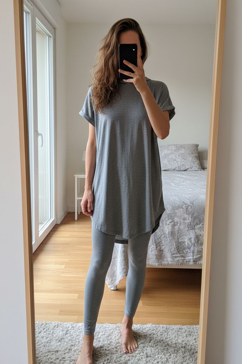 Eine Person in Lässiges T Shirt Kleid | Gr. M aufrecht stehend, der Kamera zugewandt, mit schlanker Figur, in einem sanft beleuchteten Schlafzimmer, mit natürlichem Licht, das durch ein Fenster fällt.