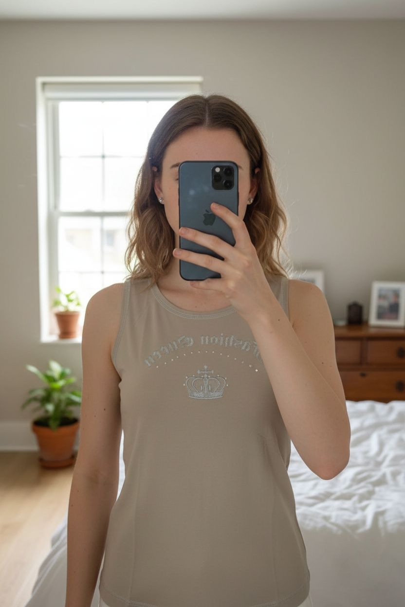 Laurèl, Top, beige, Stickerei, Gr. 40, neu aufrecht stehend, der Kamera zugewandt, in einem sanft beleuchteten Schlafzimmer, mit natürlichem Licht, das durch ein Fenster fällt.