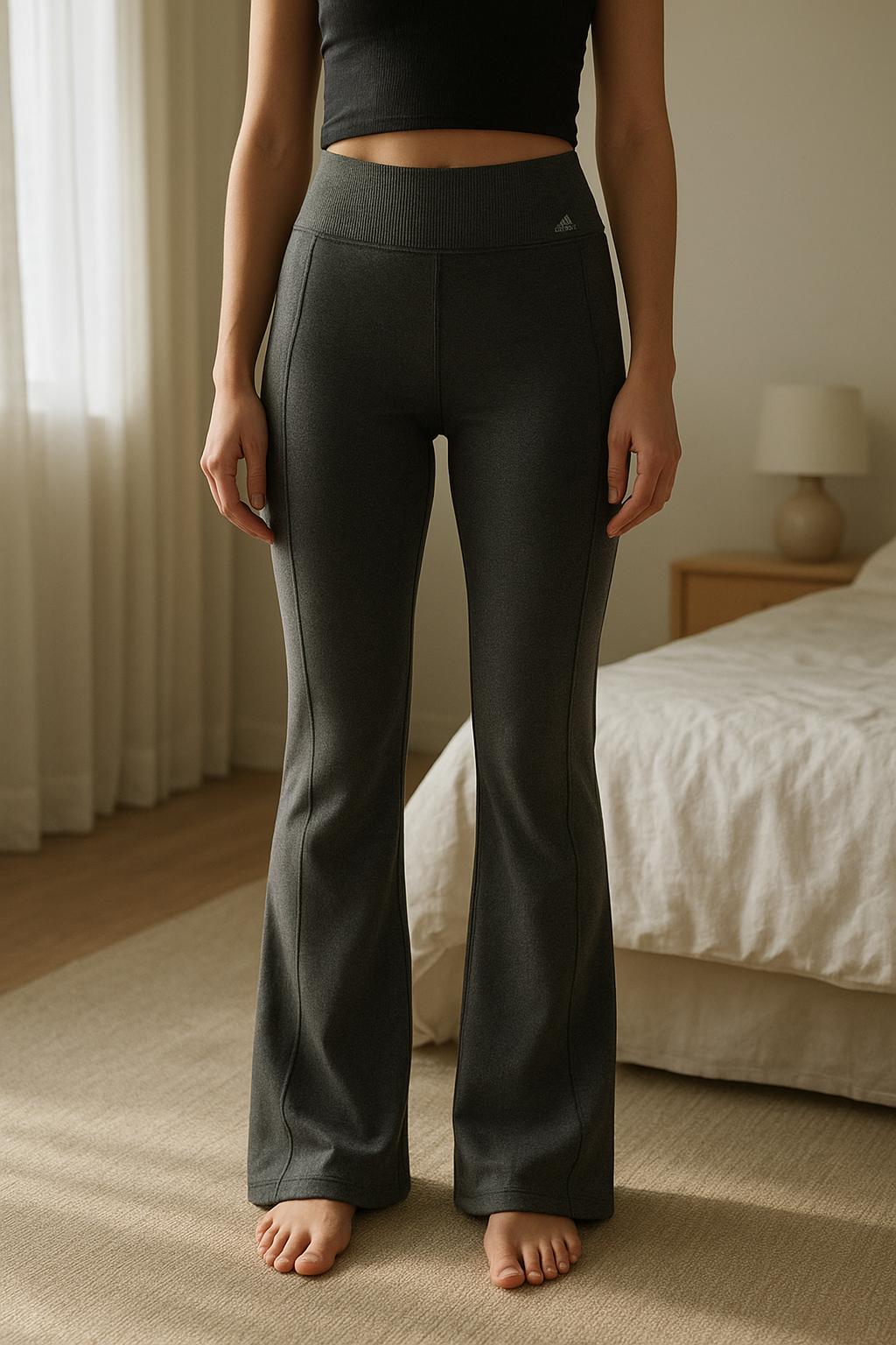 Legging Adidas aeroready noir ( taille xs) debout, face à la caméra, dans une chambre à la lumière douce, avec une lumière naturelle filtrant par la fenêtre.