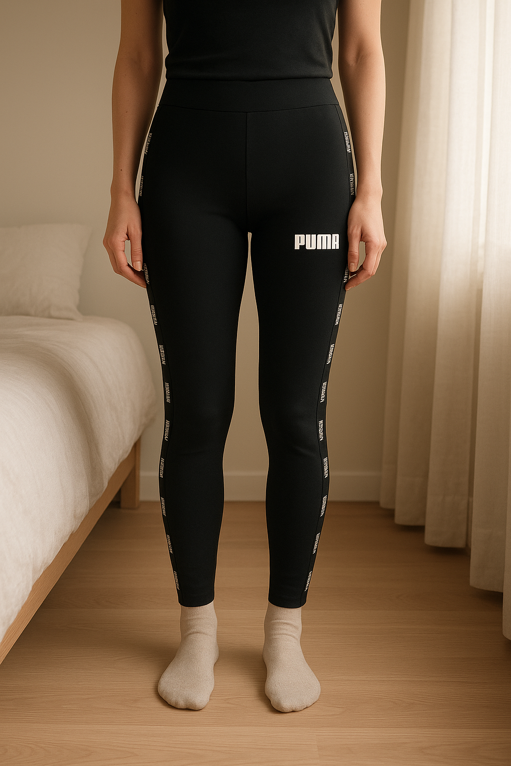 Legging puma debout, face à la caméra, dans une chambre à la lumière douce, avec une lumière naturelle filtrant par la fenêtre.