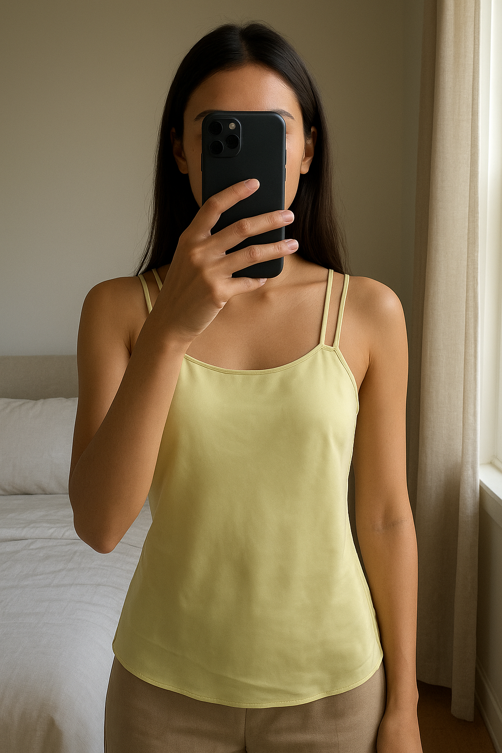 A person in Lemon Yellow Satin Cami Top standing straight facing the camera, with a slim body type, in a softly lit bedroom setting, with gentle natural light filtering through a window.