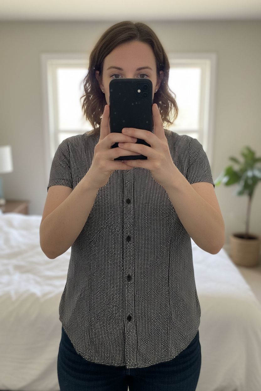 Liz Claiborne Bluse Schwarz Weiß Gr. S Baumwolle aufrecht stehend, der Kamera zugewandt, in einem sanft beleuchteten Schlafzimmer, mit natürlichem Licht, das durch ein Fenster fällt.