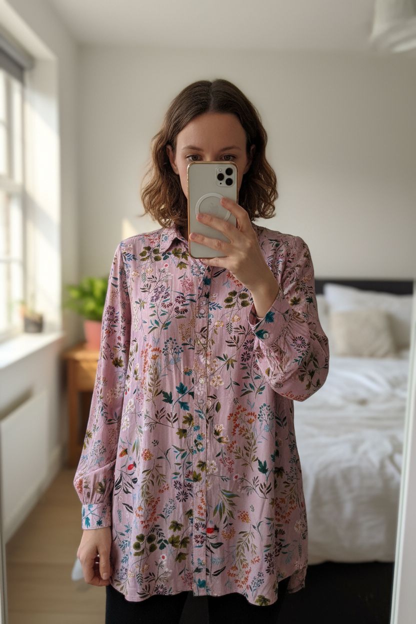 Longbluse altrosa mit Blumenmuster aufrecht stehend, der Kamera zugewandt, in einem sanft beleuchteten Schlafzimmer, mit natürlichem Licht, das durch ein Fenster fällt.