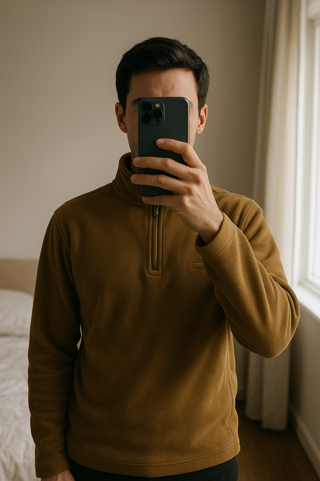 Lot de 2 Polaires Bizzbee – Taille L – Neuf debout, face à la caméra, dans une chambre à la lumière douce, avec une lumière naturelle filtrant par la fenêtre.