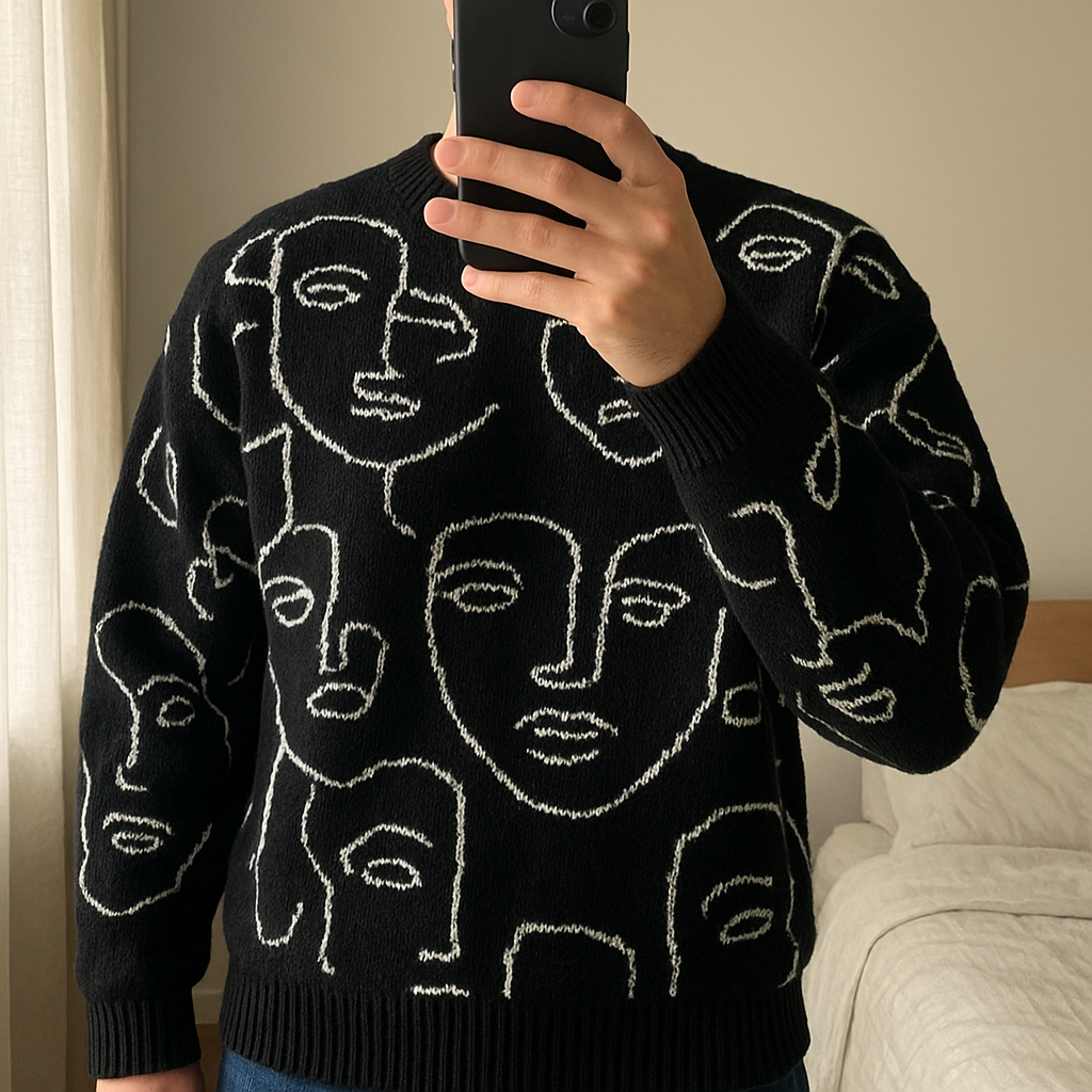 Maglione Black Circus in piedi, rivolto verso la fotocamera, in una camera da letto con luce soffusa e luce naturale che filtra dalla finestra.