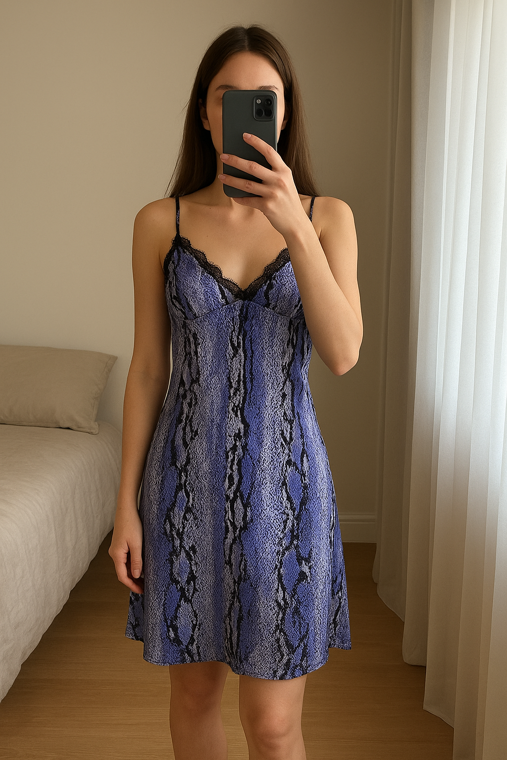 Magnifique nuisette debout, face à la caméra, dans une chambre à la lumière douce, avec une lumière naturelle filtrant par la fenêtre.