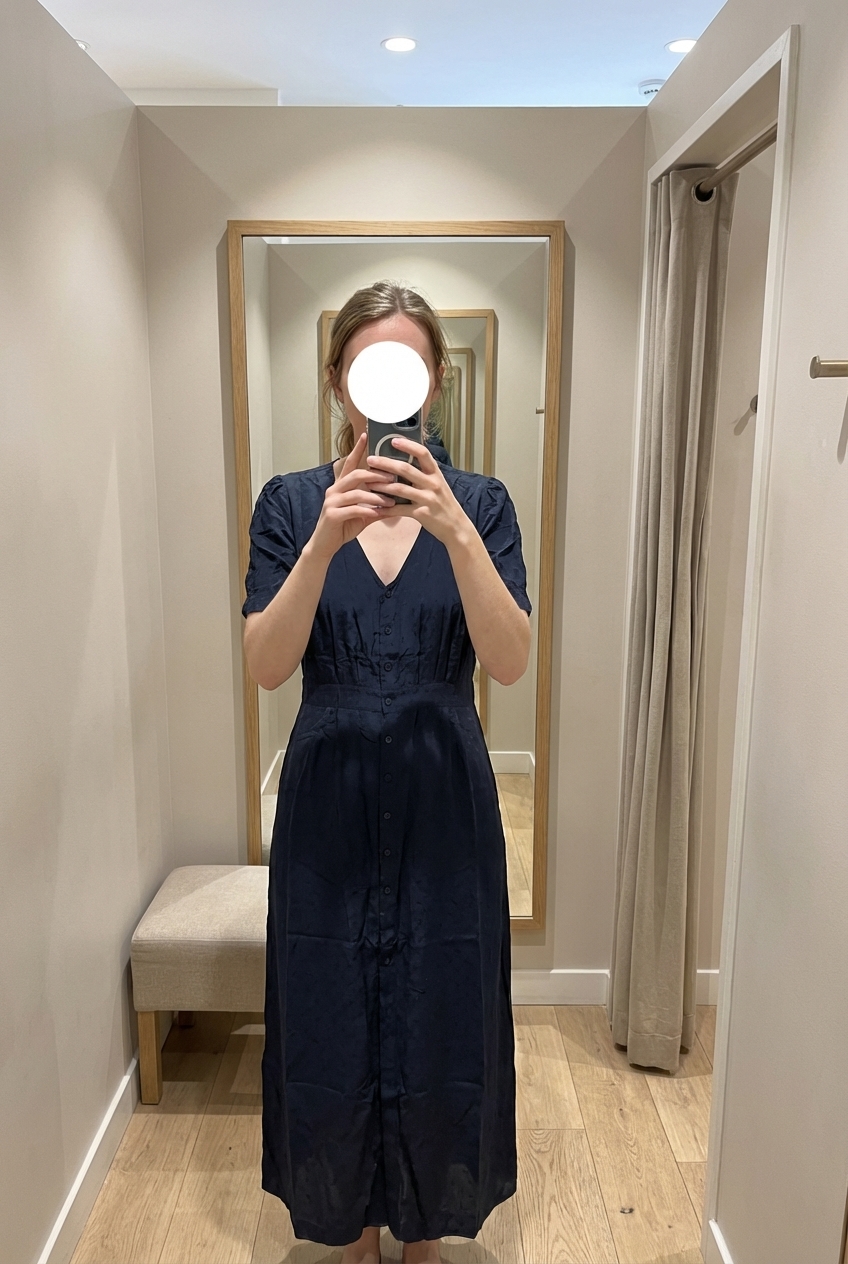 Une personne en Magnifique robe villa debout, face à la caméra, dans une cabine d’essayage de style boutique avec un miroir et une décoration neutre.