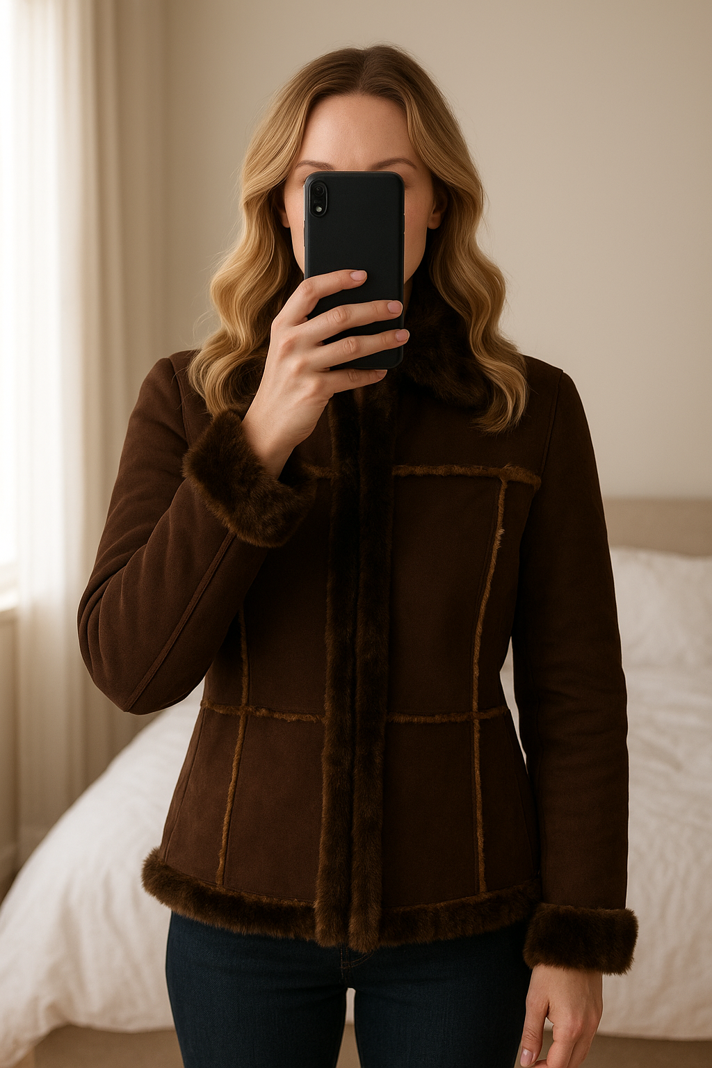 Magnifique Veste Maison 123 debout, face à la caméra, dans une chambre à la lumière douce, avec une lumière naturelle filtrant par la fenêtre.