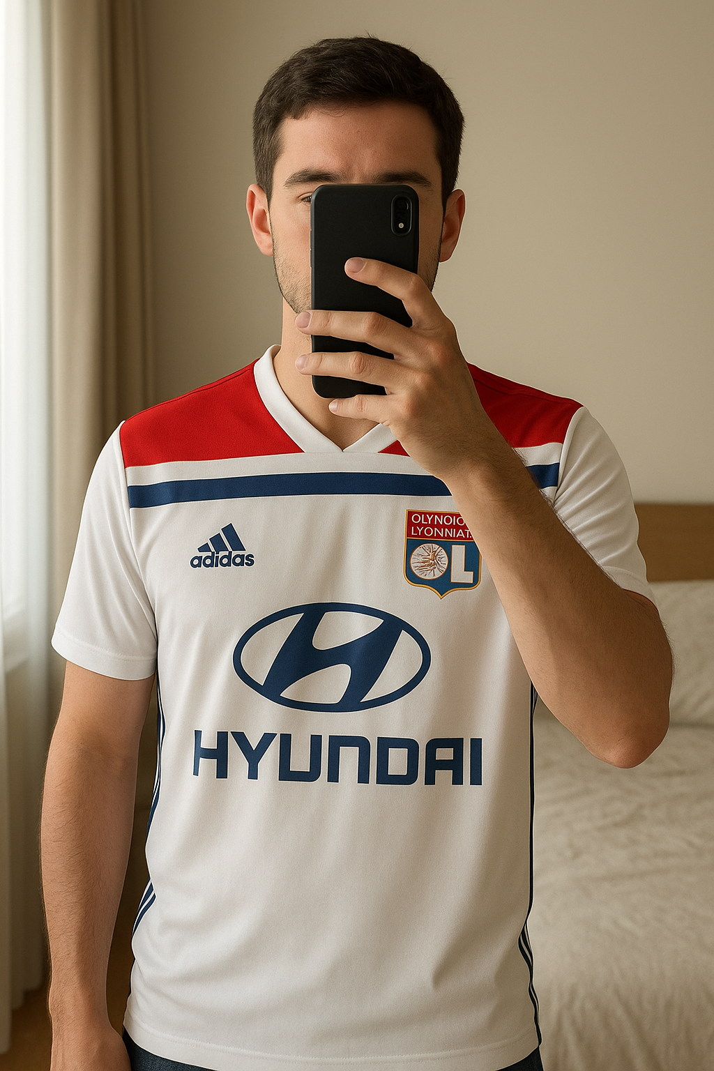 Maillot de foot debout, face à la caméra, dans une chambre à la lumière douce, avec une lumière naturelle filtrant par la fenêtre.