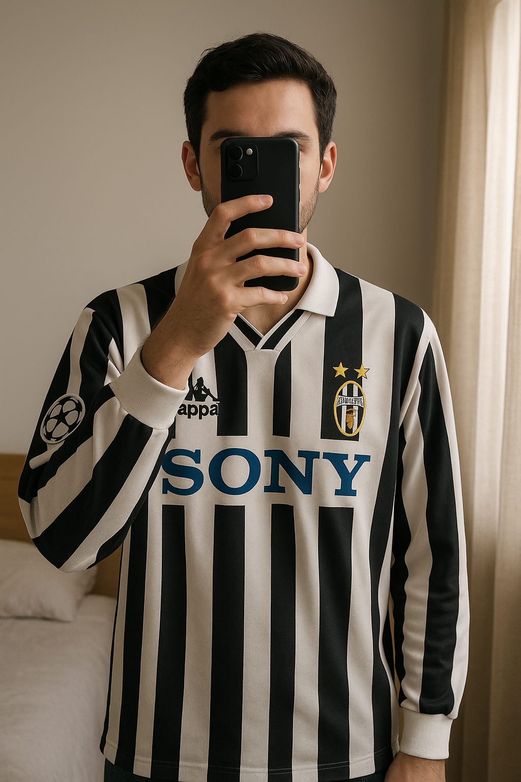 Maillot Juventus - Saison 1995/1996 debout, face à la caméra, dans une chambre à la lumière douce, avec une lumière naturelle filtrant par la fenêtre.