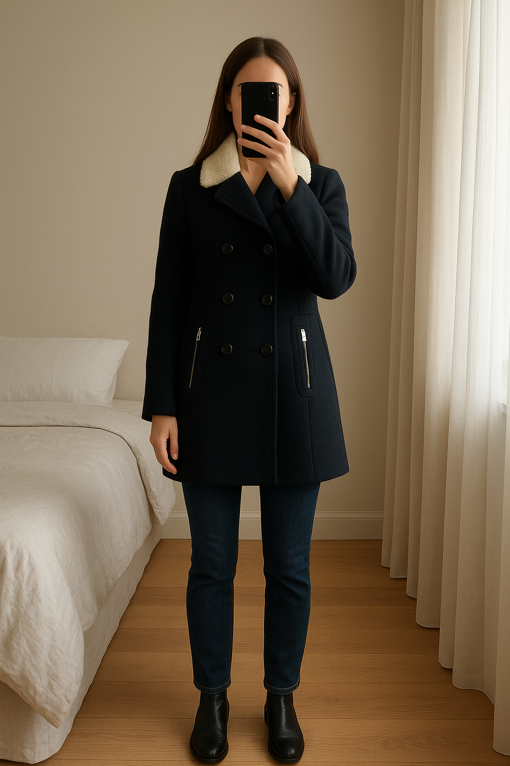 Manteau caban Claudie Pierlot laine taille 36 debout, face à la caméra, dans une chambre à la lumière douce, avec une lumière naturelle filtrant par la fenêtre.