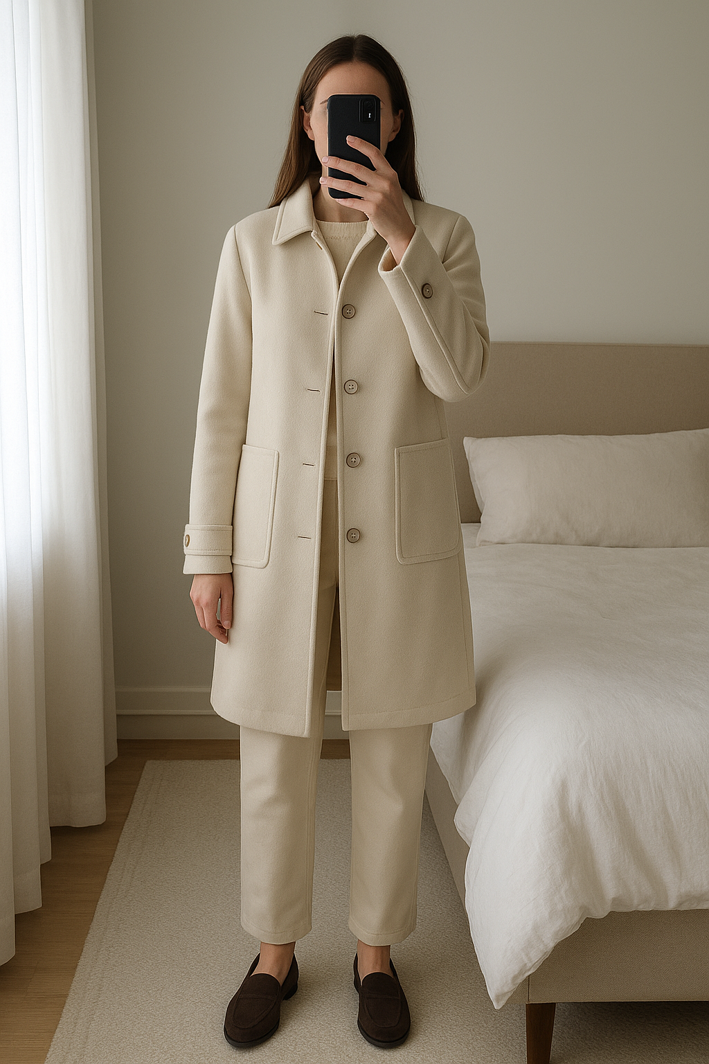 Manteau crème Morgan taille 36 debout, face à la caméra, dans une chambre à la lumière douce, avec une lumière naturelle filtrant par la fenêtre.