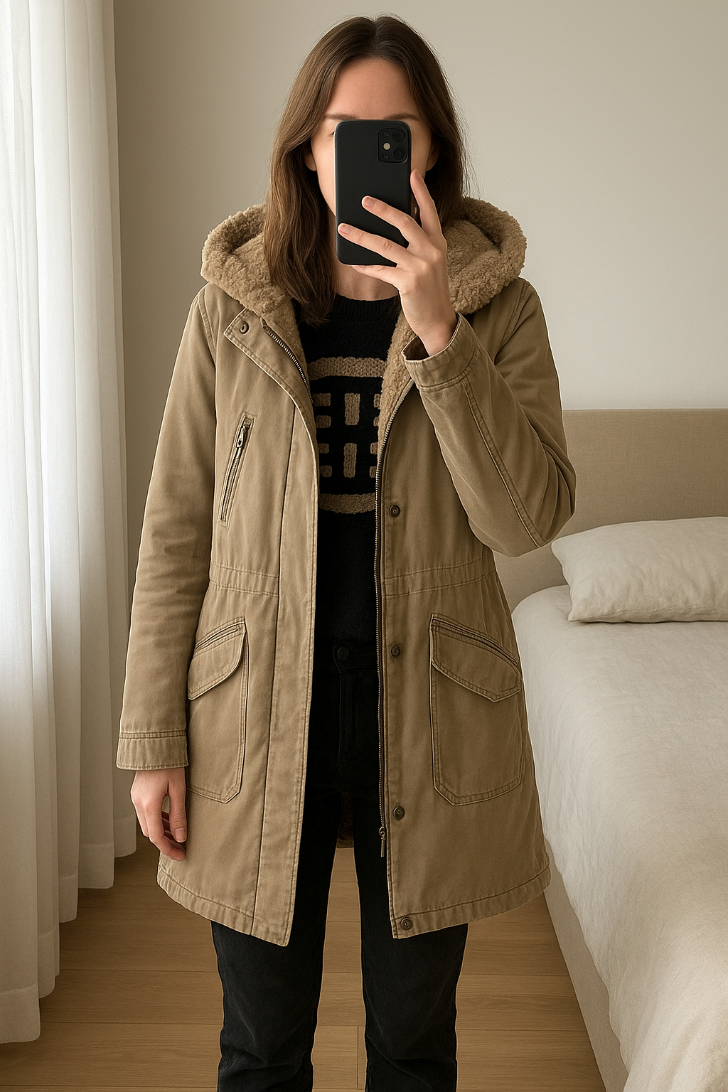 Manteau d’hiver debout, face à la caméra, dans une chambre à la lumière douce, avec une lumière naturelle filtrant par la fenêtre.