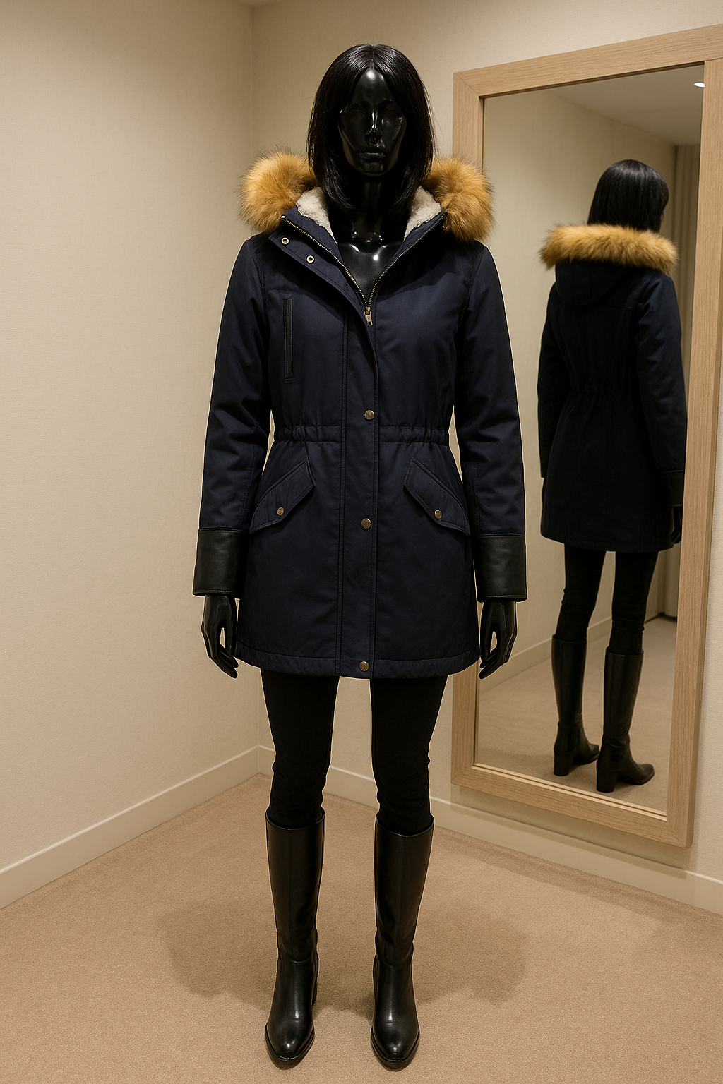 un mannequin noir brillant en plastique, sans traits du visage en Manteau duffle-coat debout, face à la caméra, avec une silhouette fine, dans une cabine d’essayage de style boutique avec un miroir et une décoration neutre.